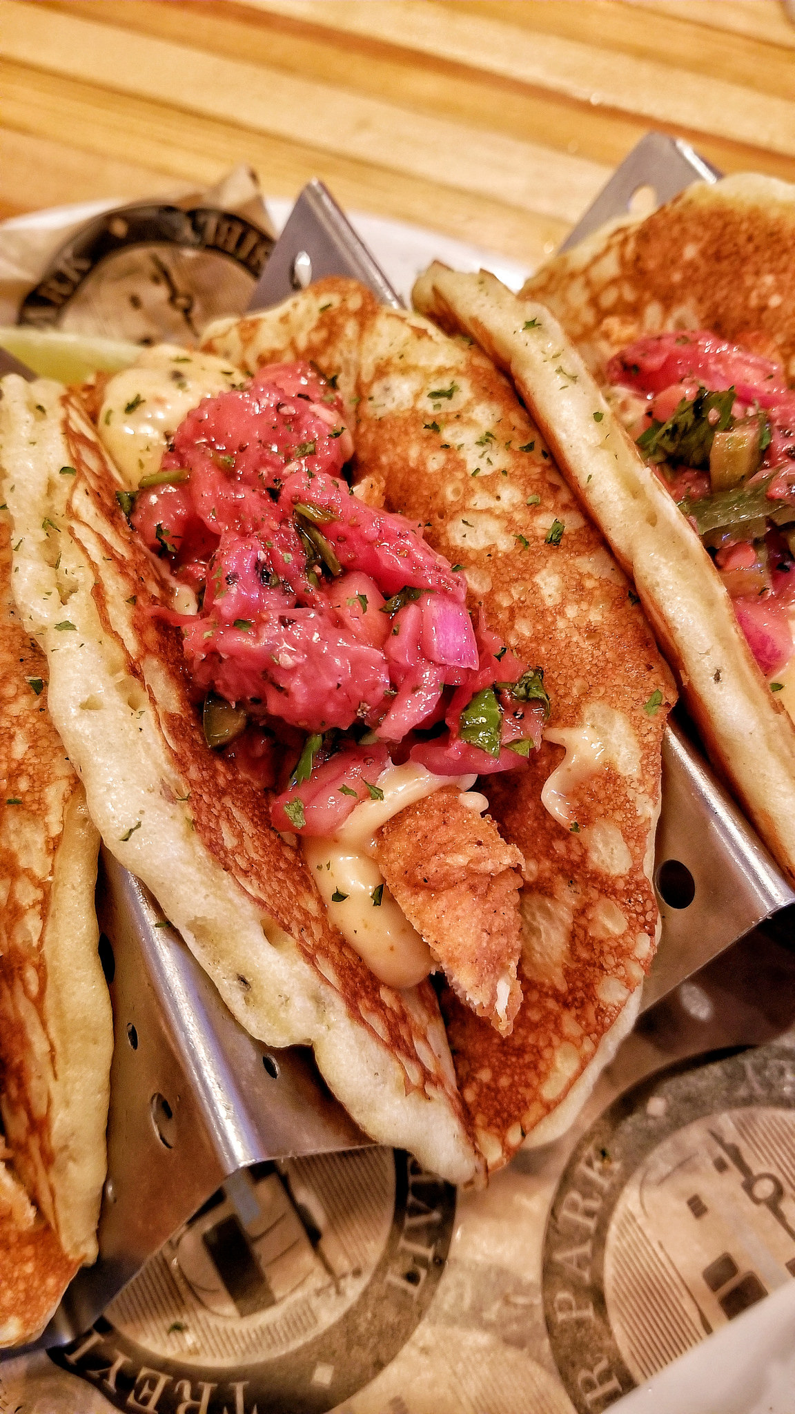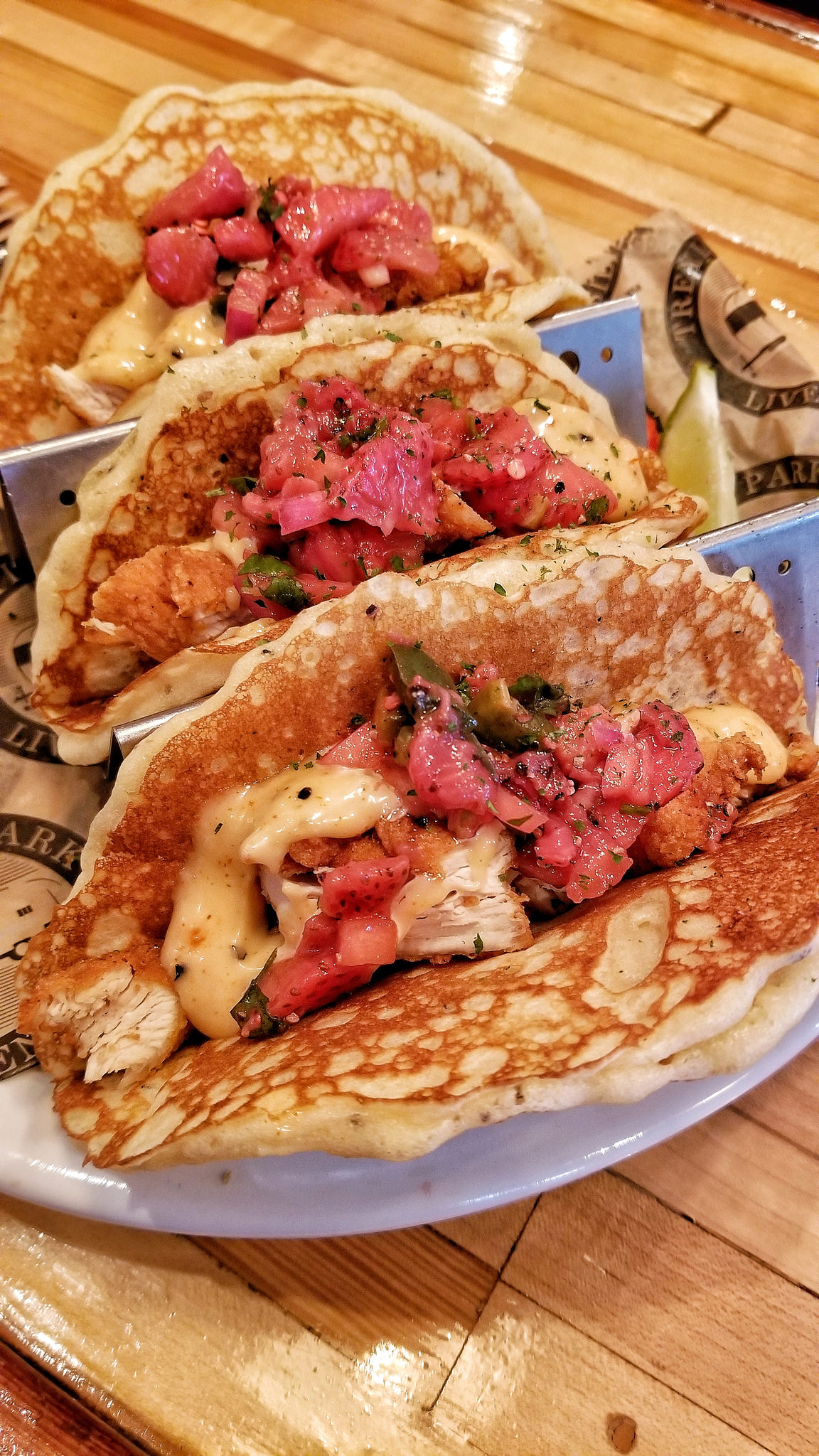 I took a seat at the bar and ordered the Flying Wasp made with mint tea vodka, lemon, and simple syrup. It was refreshing and delicious. To eat, I tried the Chicken & Pancake Tacos which had pieces of fried chicken in lightly toasted peppered pancakes topped with chili aioli and strawberry salsa. Good stuff!