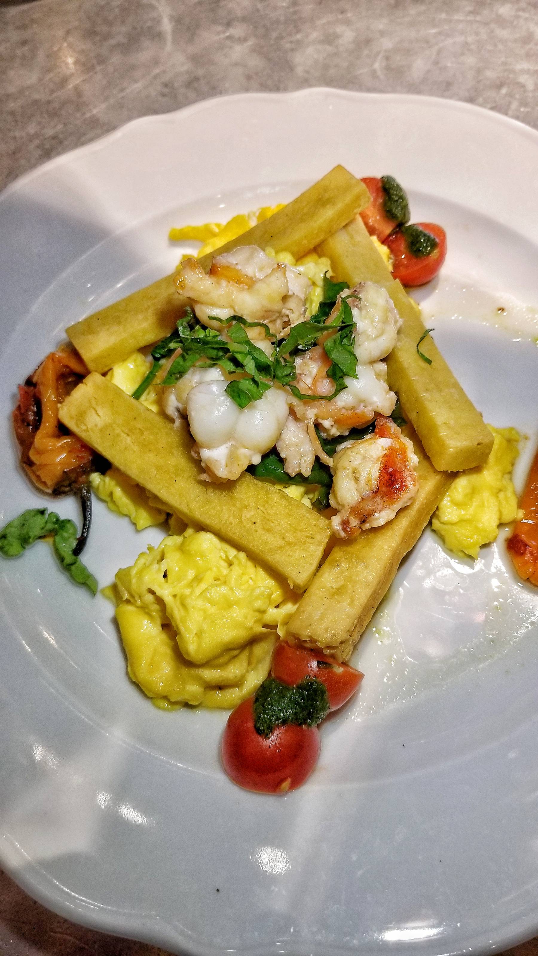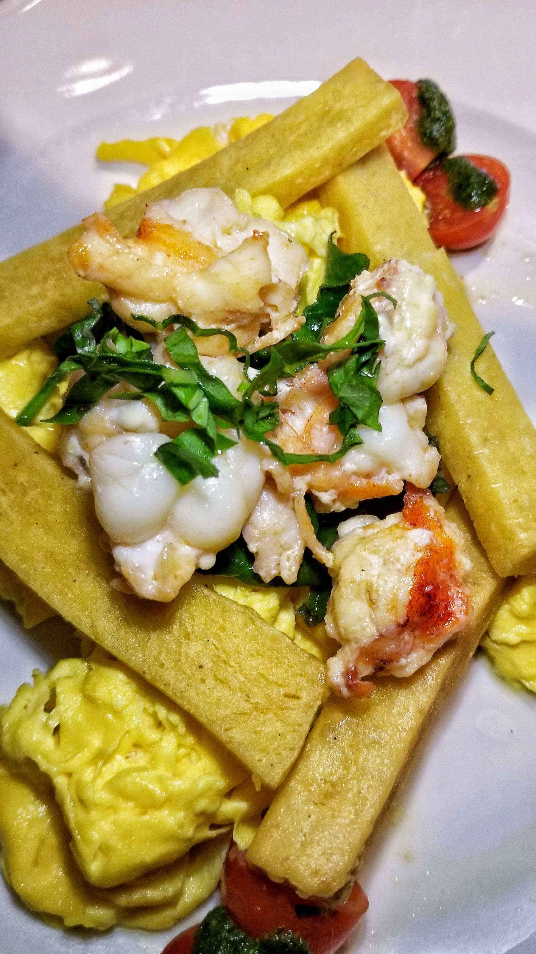 For my entree, I went with the Maine Lobster Scramble. The chunks of lobster sat on top of scrambled eggs with Bloomsdale spinach, piperade (a typical Basque dish of sauteed peppers and tomatoes flavored with red pepper), fresh basil, cherry tomatoes, and chickpea fries.