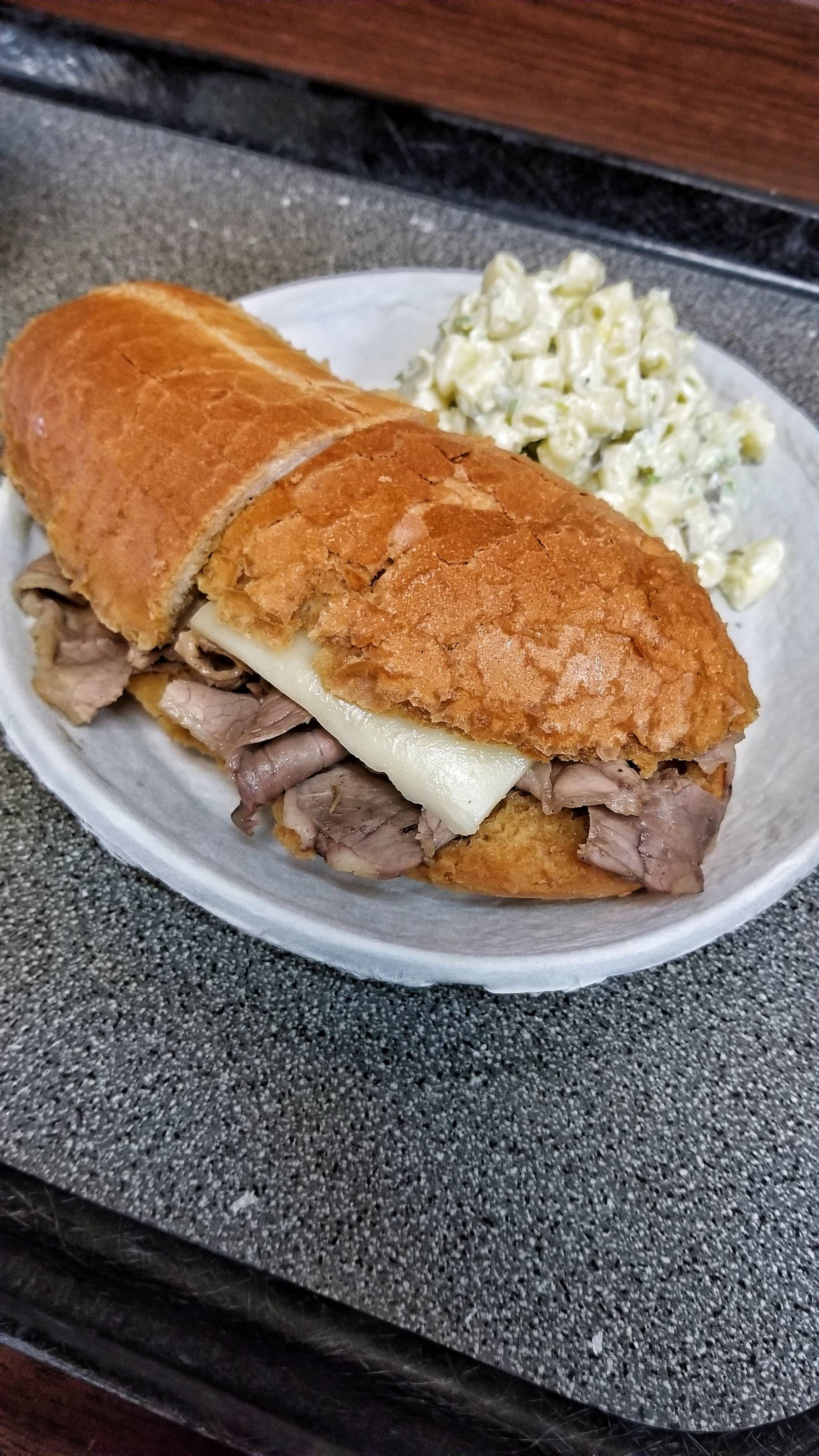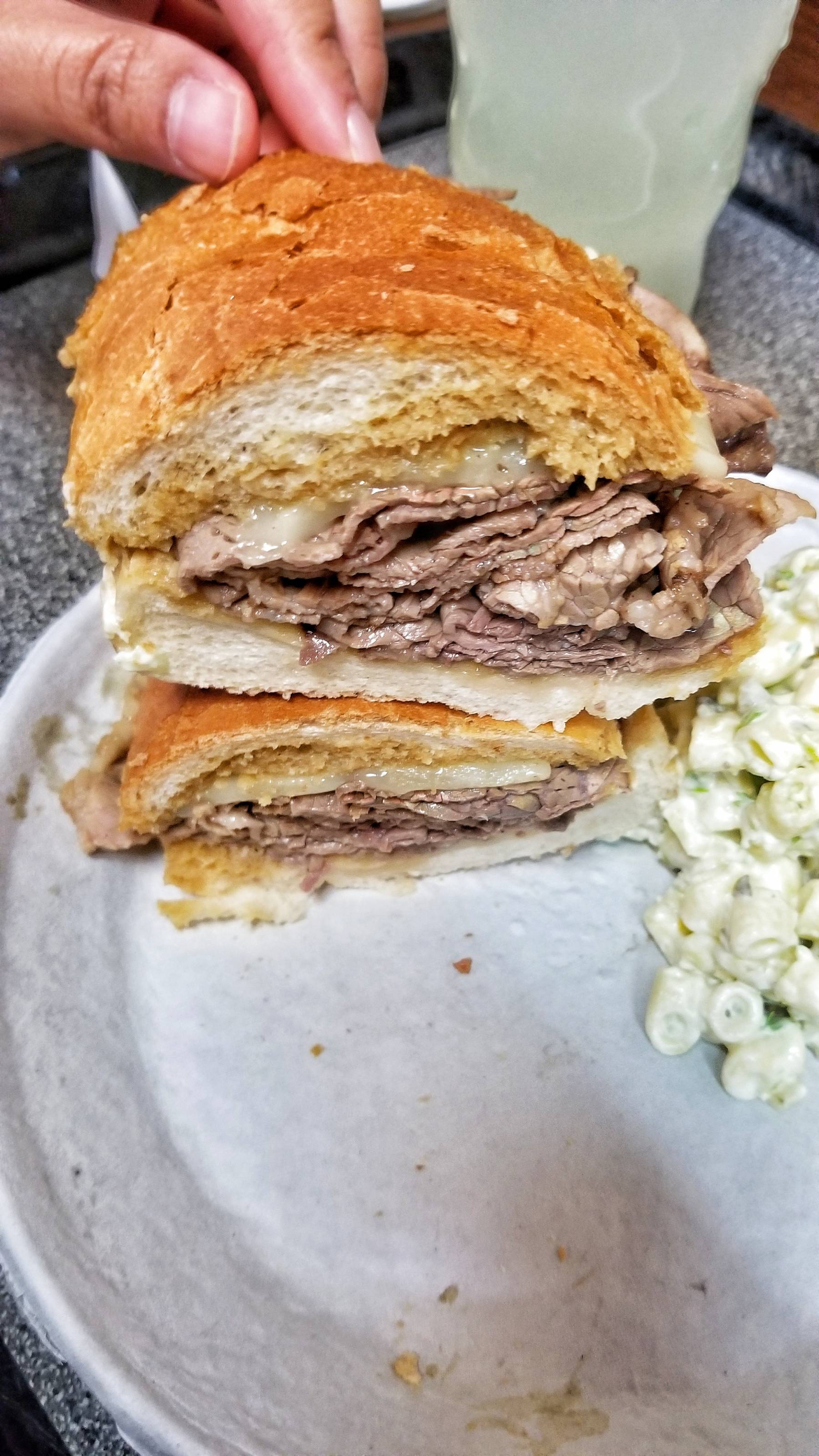 I gotta say, I thought the sandwich was really good. The bread held up nicely, but was still soft. The warm jus was flavorful and not too salty. The roast beef is pretty well done and standard, but it all worked for a satisfying sandwich. The tangy macaroni salad was good too. I grabbed a squeeze bottle of their just-as-famous hot mustard and it made things even better!