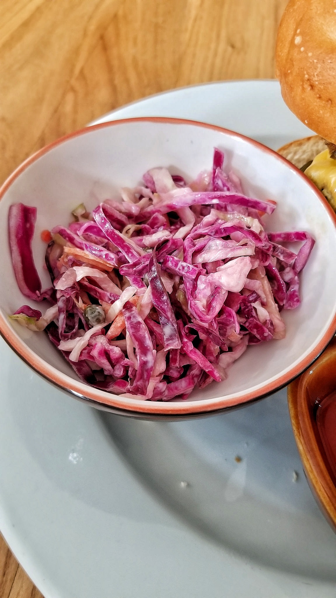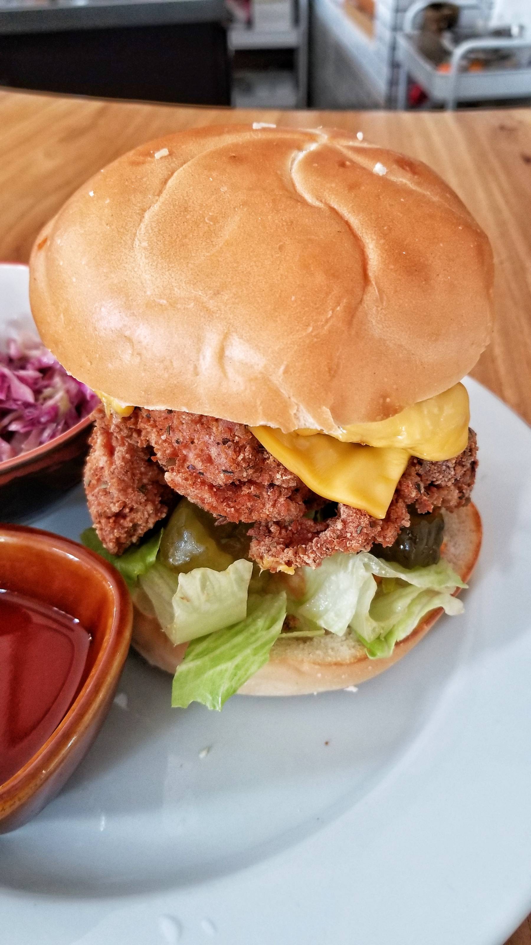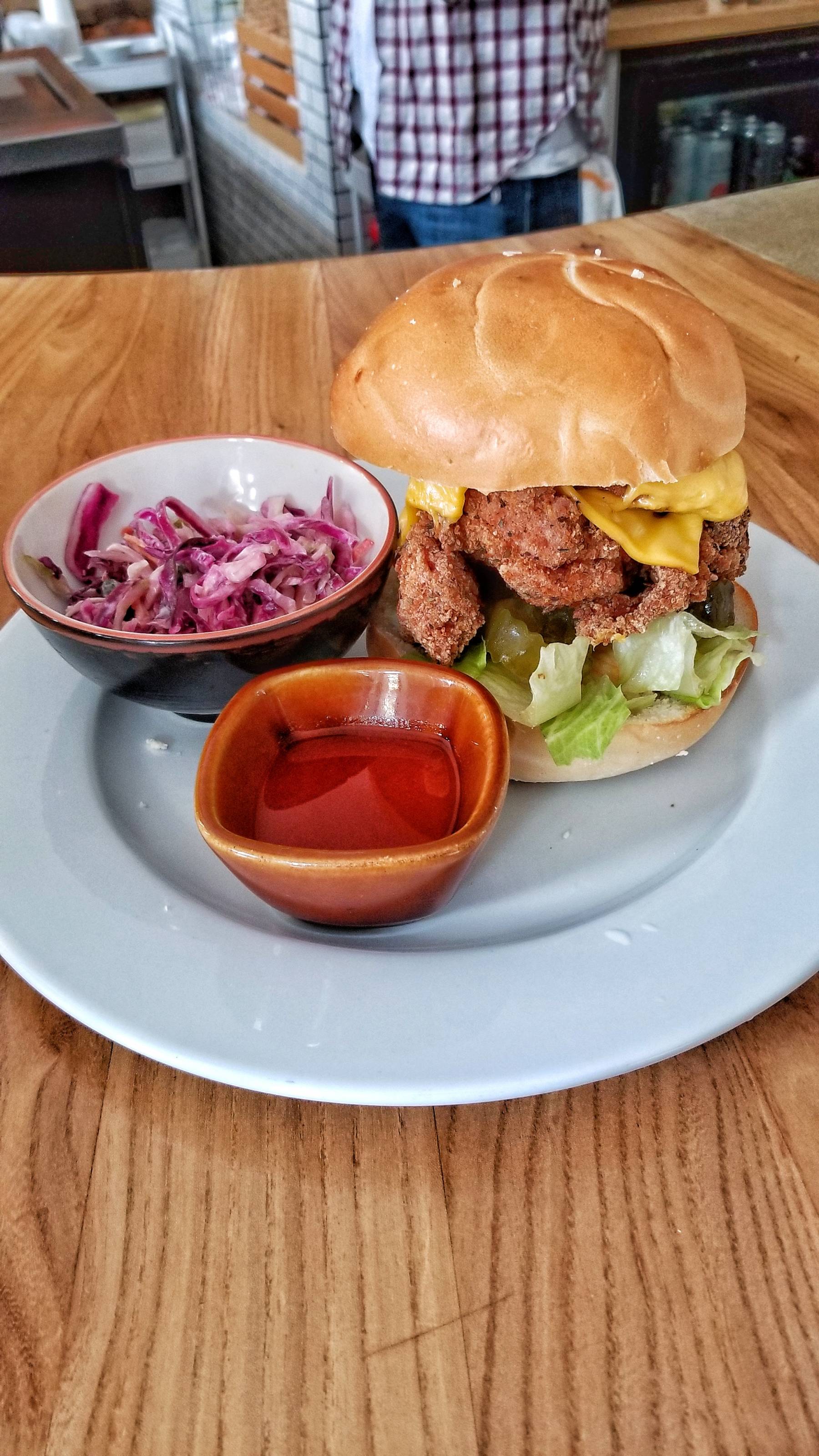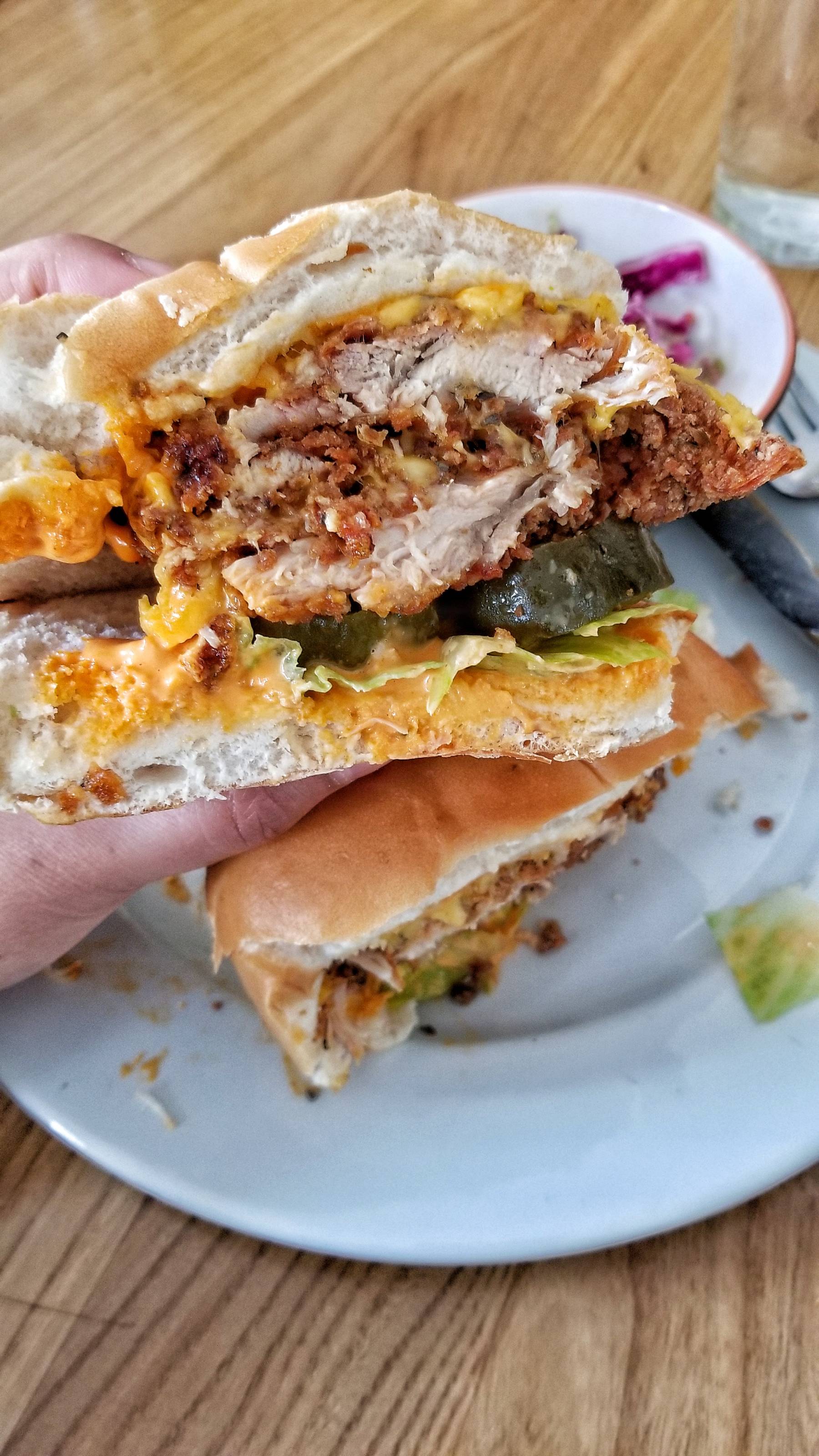The chicken sandwich was a good size. It had crispy buttermilk fried chicken, American cheese, pickles, lettuce, and plum pepper aioli. It came with a side of slaw and hot sauce. Super filling and good.