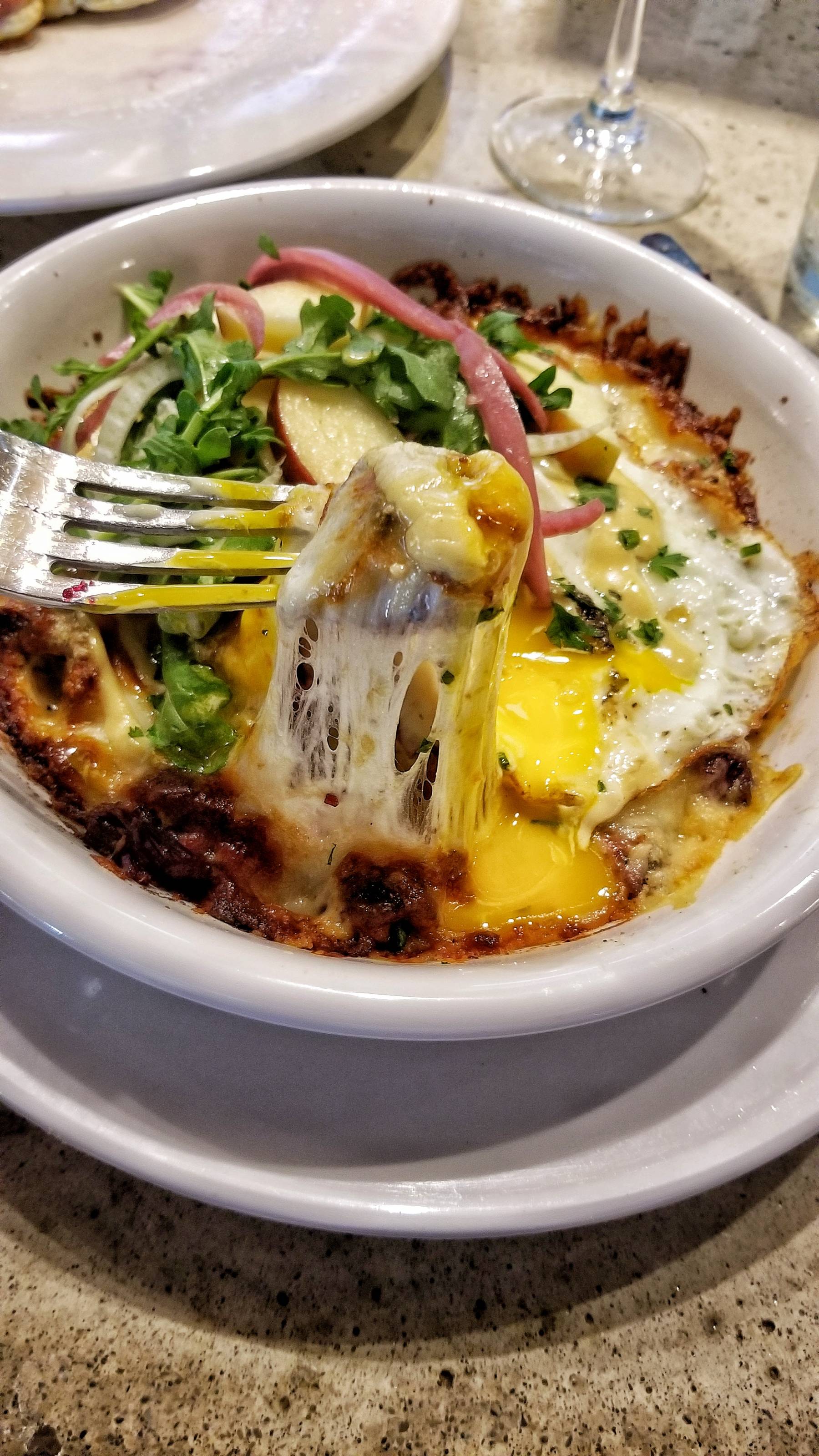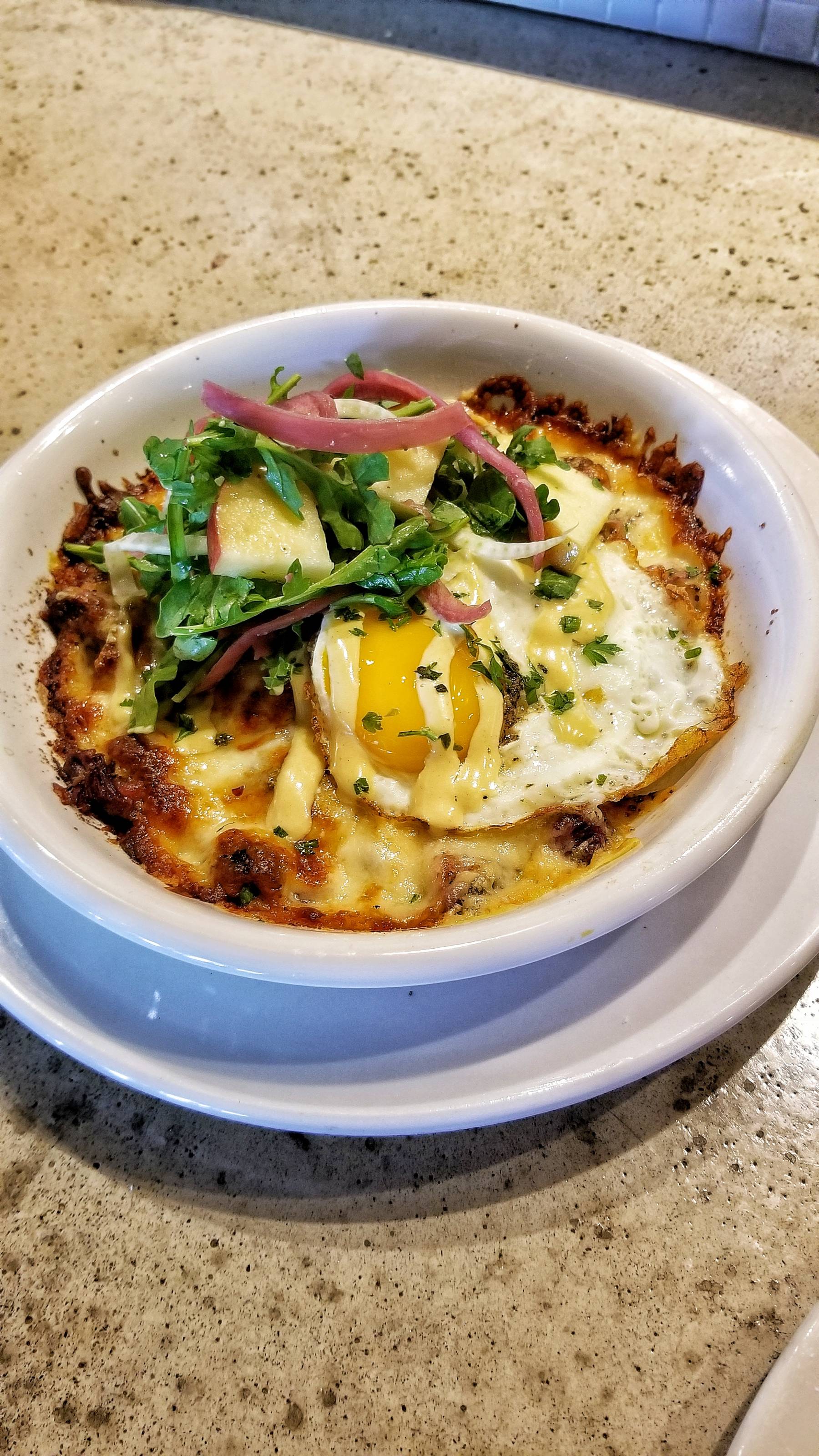And since I’m a sucker for hash, I had to try the Local Beef Smoked Pastrami Hash with chunks of smoked pastrami, Yukon potatoes, and Gruyère cheese baked together in a dish and topped with apple, arugula, pickled red onion, honey dijon aioli, and a fried egg. It was flavorful and cheesy.