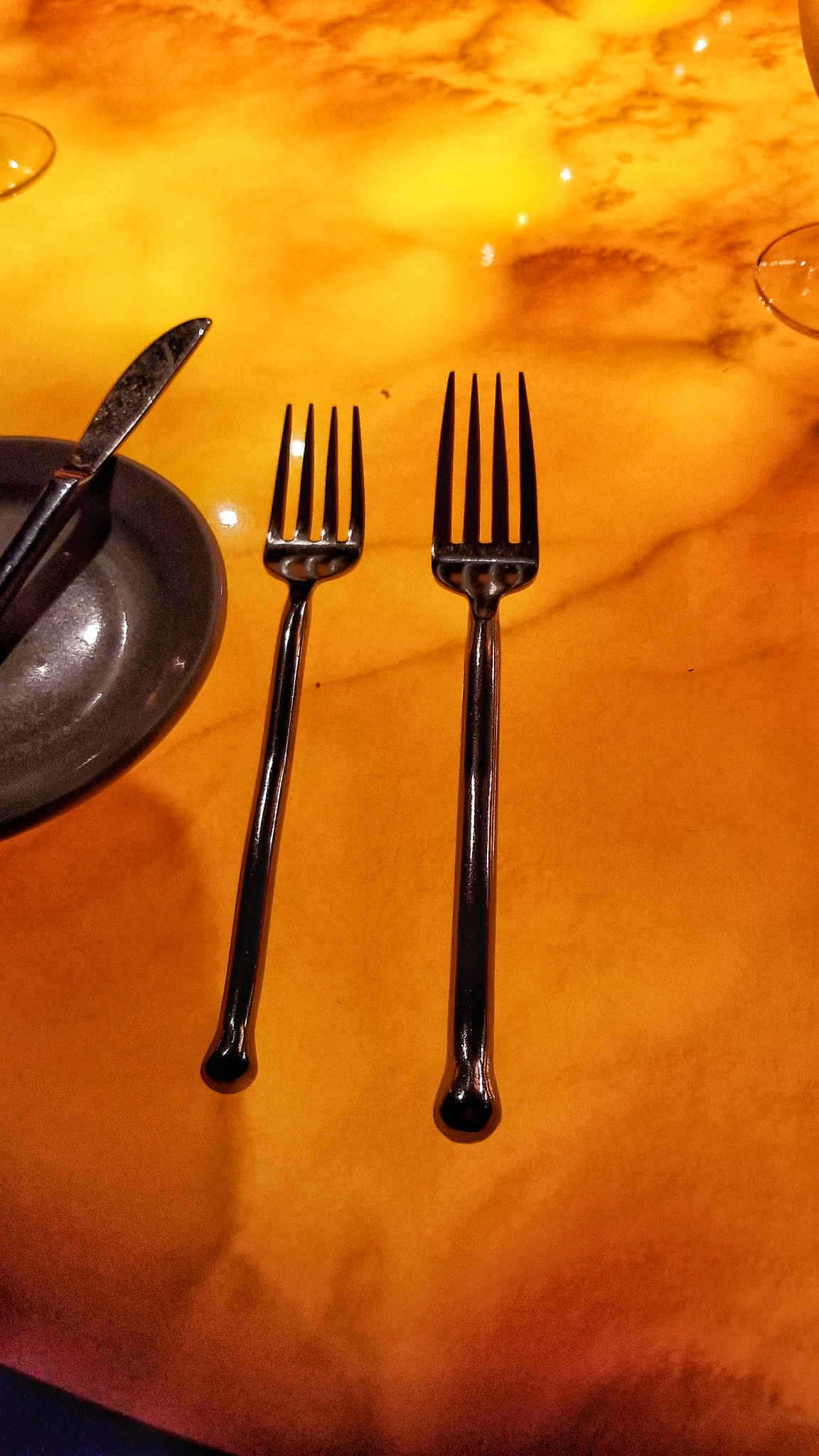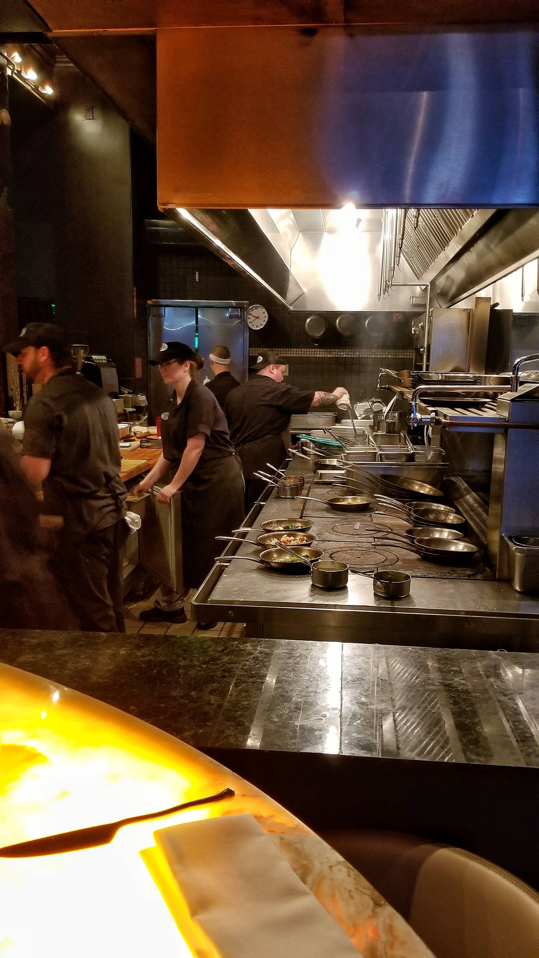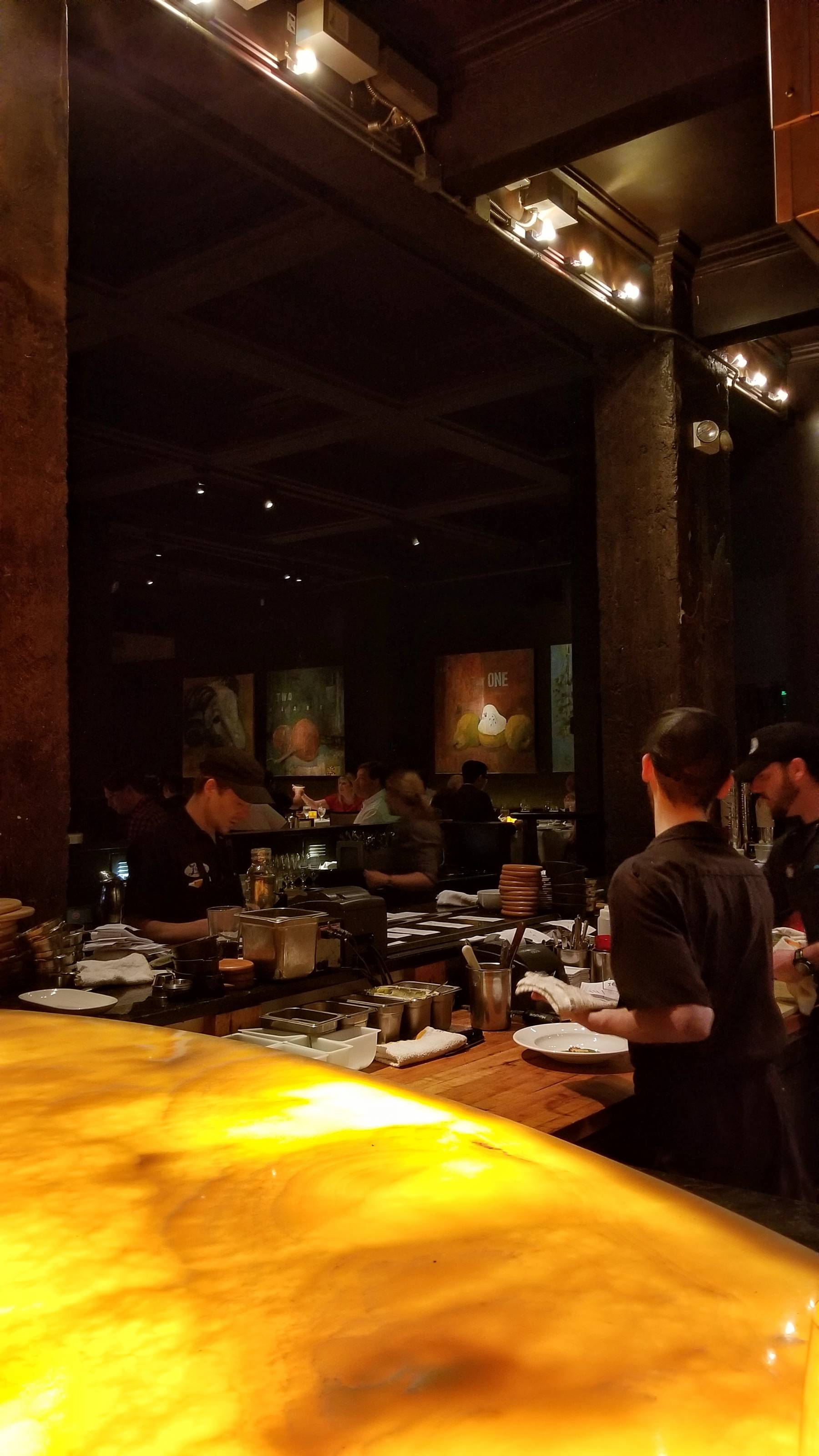 I arrived for my Sunday night reservation and sat at the Chef’s Counter overlooking the kitchen. The restaurant was dark and elegant. The counter possessed a warm amber glow.