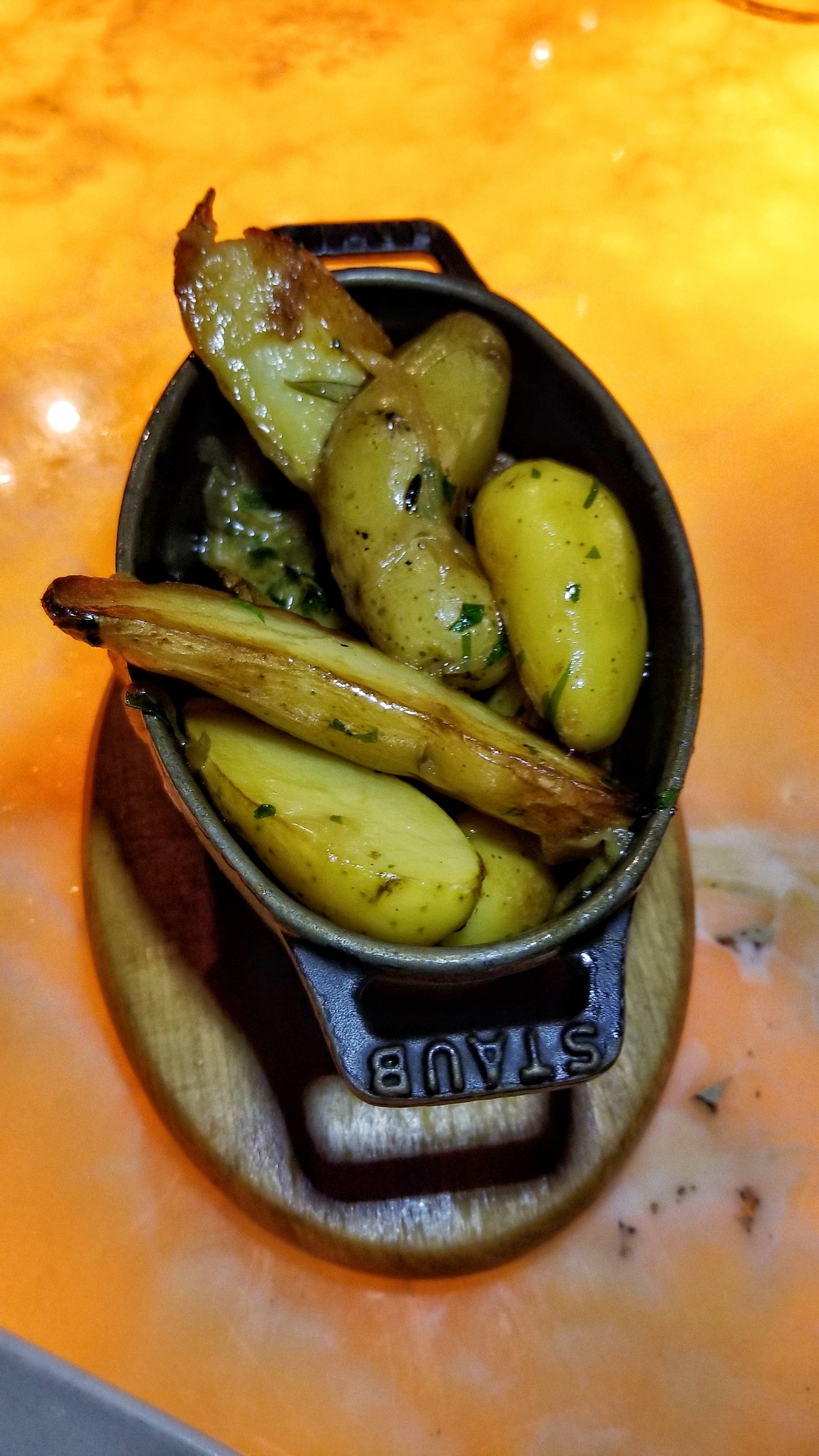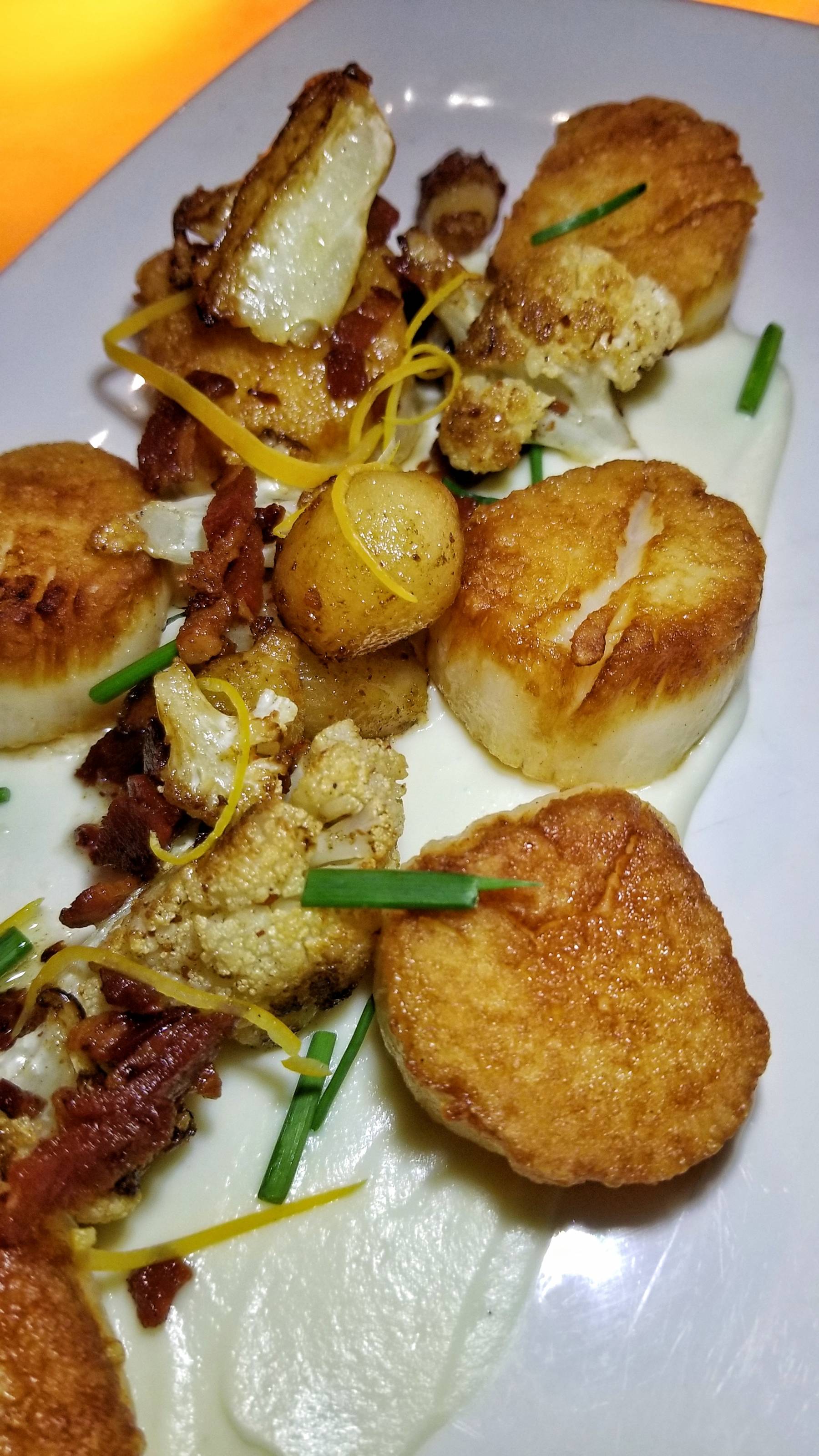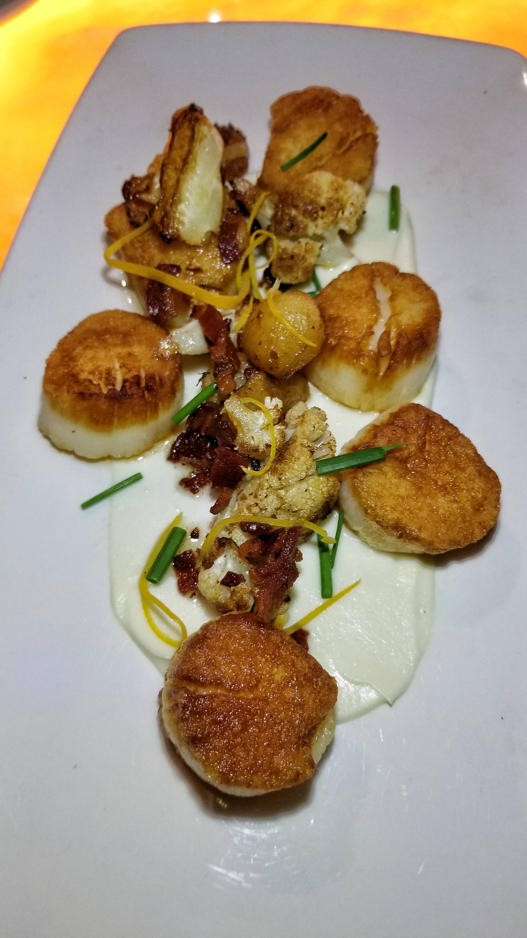 For a main, I went with the Sea Scallops with cauliflower, caramelized onions, Meyer lemon, and bacon bits. The scallops had a nice sear and were tender. There were salty, tart, and savory flavors. I also had the Potato Lyonnaise as a side. The potatoes and onions are sauteed in butter and parsley. I would have liked them to be crispier though.