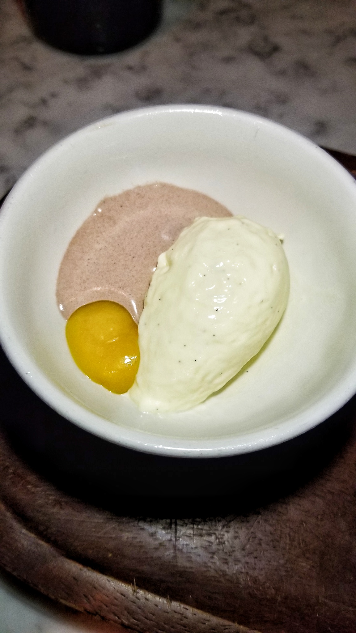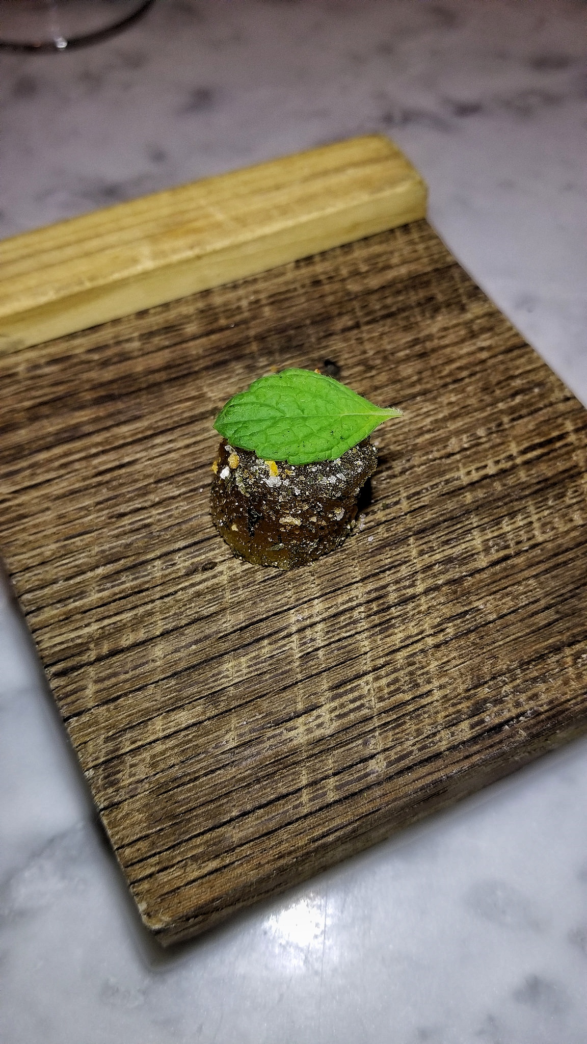 The first course of snacks concluded with incredible Coppa Secca (dry-cured capicollo) on an elephant ear with bagna cauda (dipping sauce made with olive oil, chopped anchovies and garlic) and giardiniera (relish). That was accompanied by a Coddled Egg with sherry Chantilly (a sweetened, vanilla-flavored whipped cream) and smoked maple. Yummm.