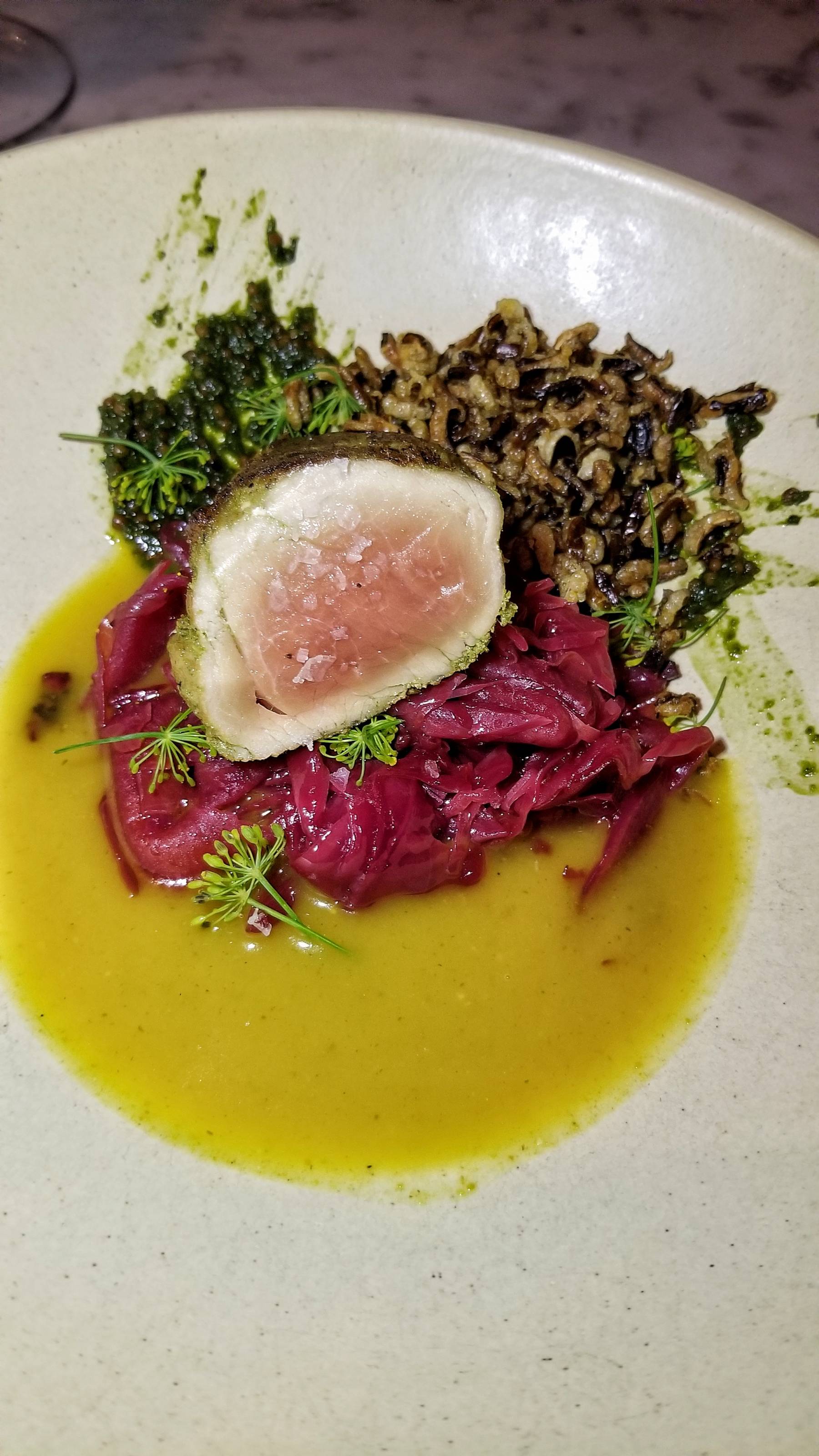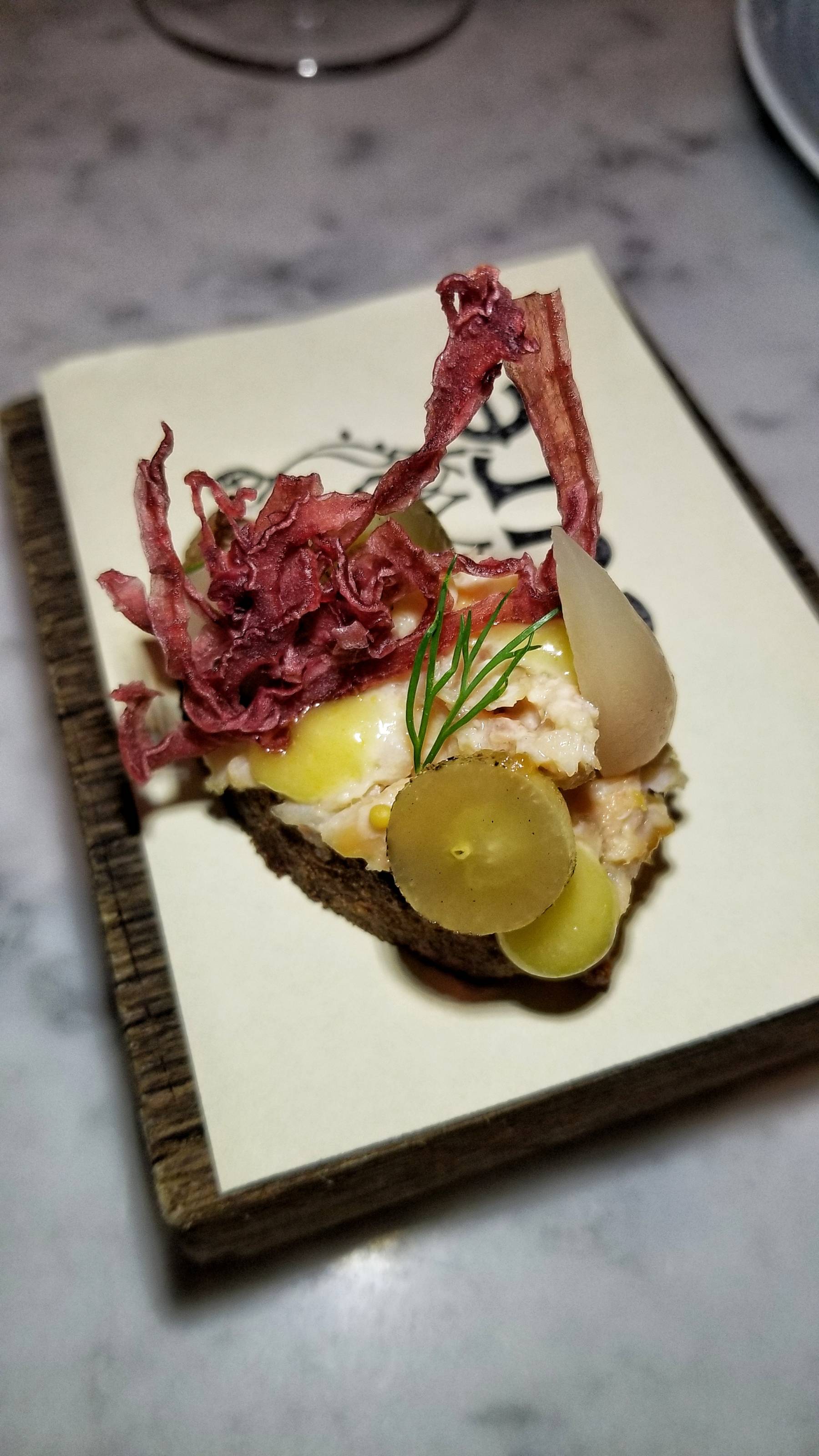 We were already off to a great start. The next couple snacks were the flavorful Smoked Trout Toast with pickled ramp, blistered grape, preserved lemon, and dehydrated red onion followed by the Tuna Finocchiona (salami with fennel) with pickled fennel and fennel pollen & brittle.