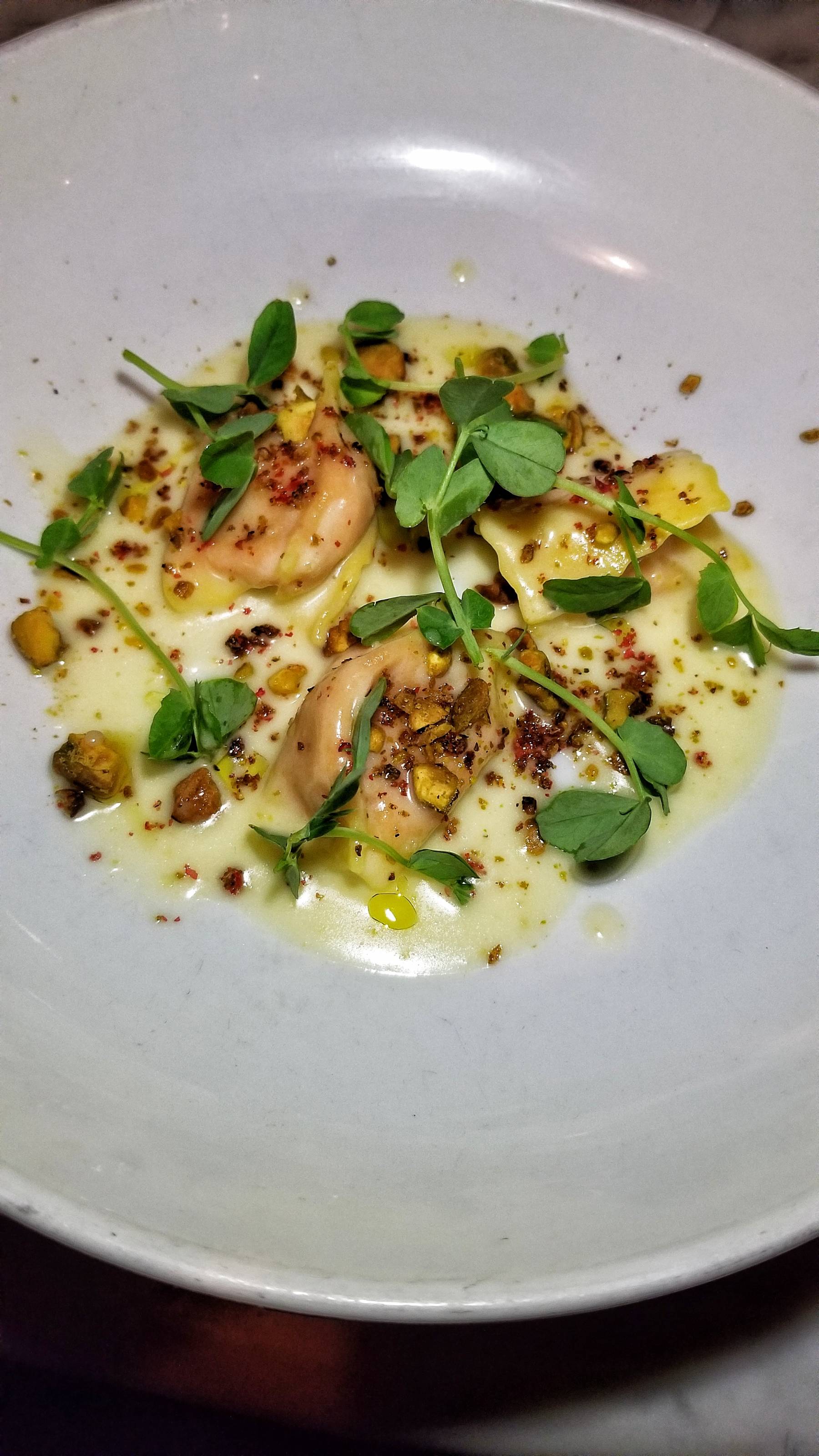 The third course was Agnolotti with beet, goat cheese, pistachio, and pea tendrils (stems and leaves) paired with a Rosé from Bordeaux, France.