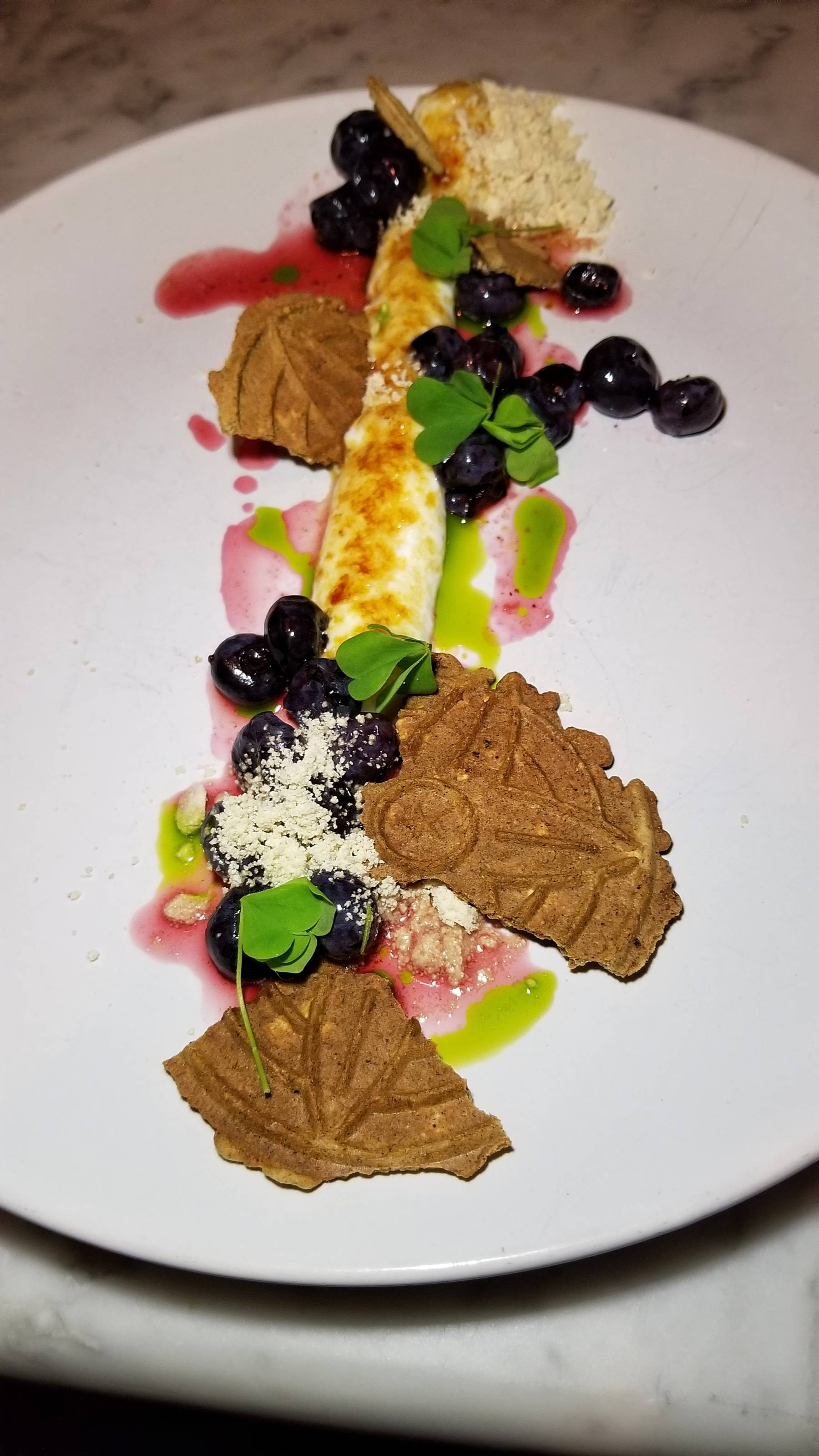It was time to transition to the sweeter side of things. The fifth course was a Brûléed Goat Rodeo Chèvre with savory pizzelle pieces, blueberry, thyme, and sesame. The final pairing was a Henriques & Henriques Boal 10 Year Madeiria from Portugal.
