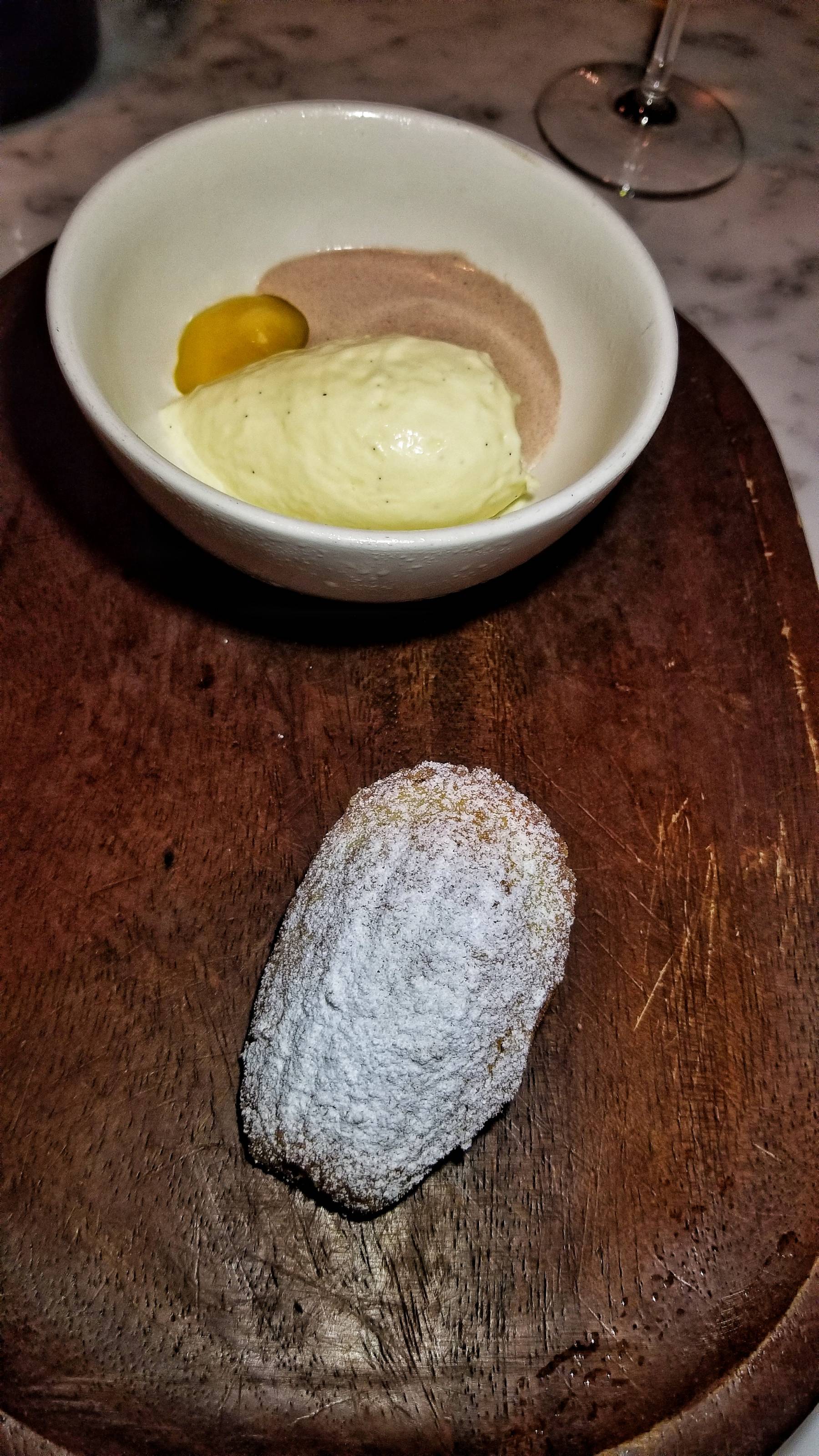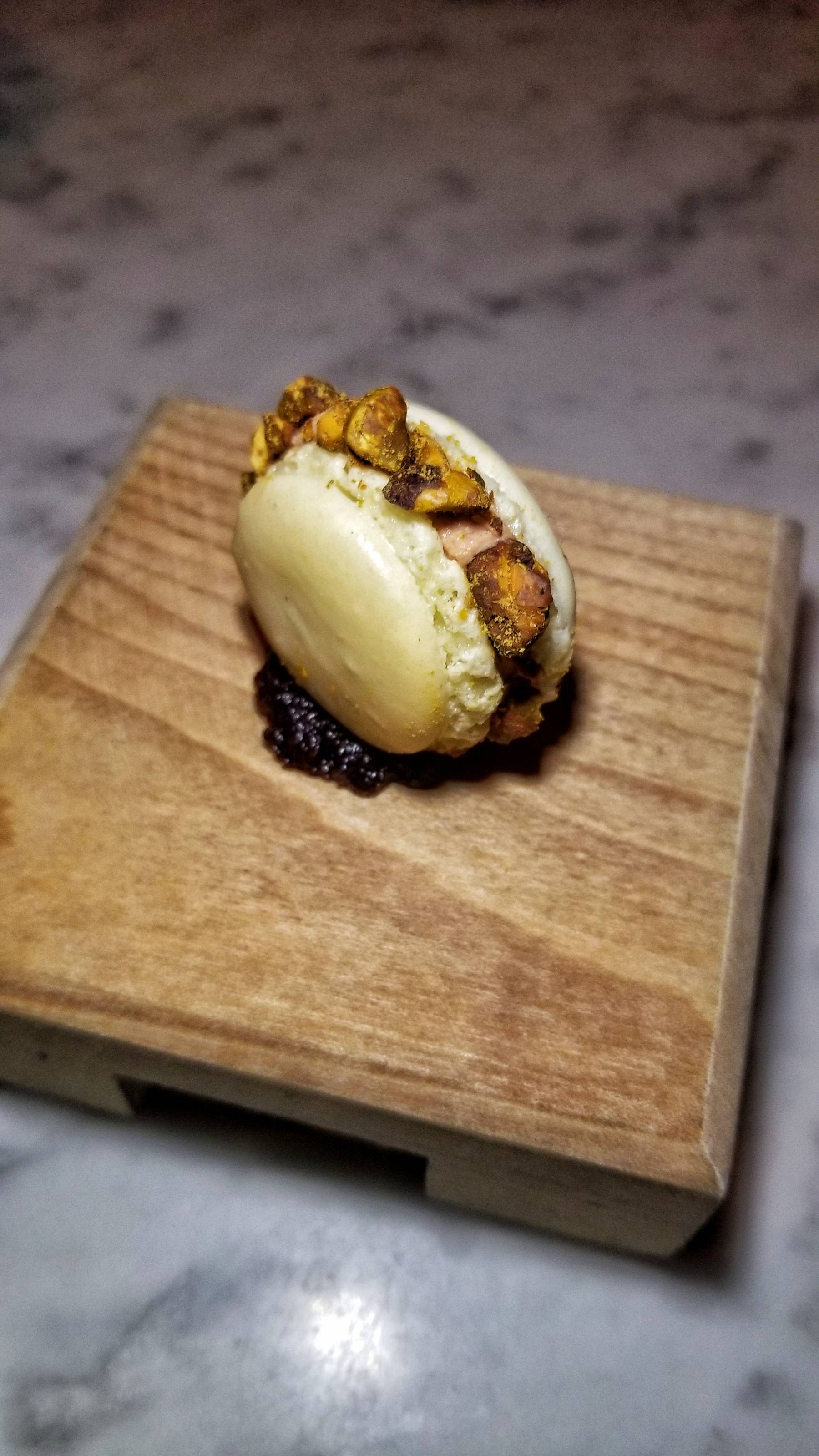 The sixth course was another series of snacks, this time for dessert. These included a Macaron with foie blonde, pistachio, hibiscus, and quince. Nice! There was a homemade Medeleine made with spiced rum and served with Vanilla Ice Cream with cocoa Chantilly and orange custard. So good! The last bite was a Pâte de Fruit (fruit jelly candy) made with meyer lemon and genmaicha (Japanese brown rice green tea).