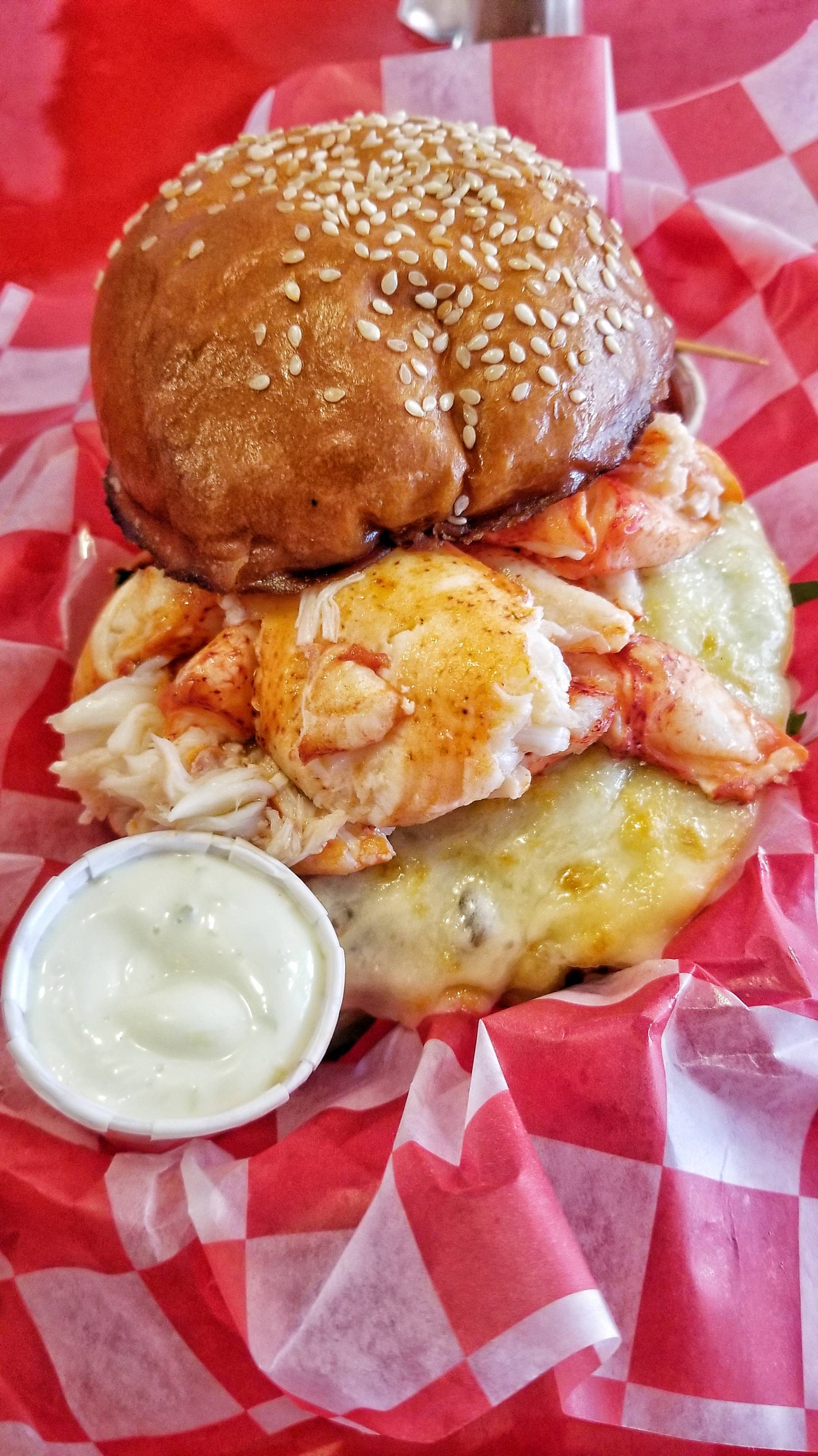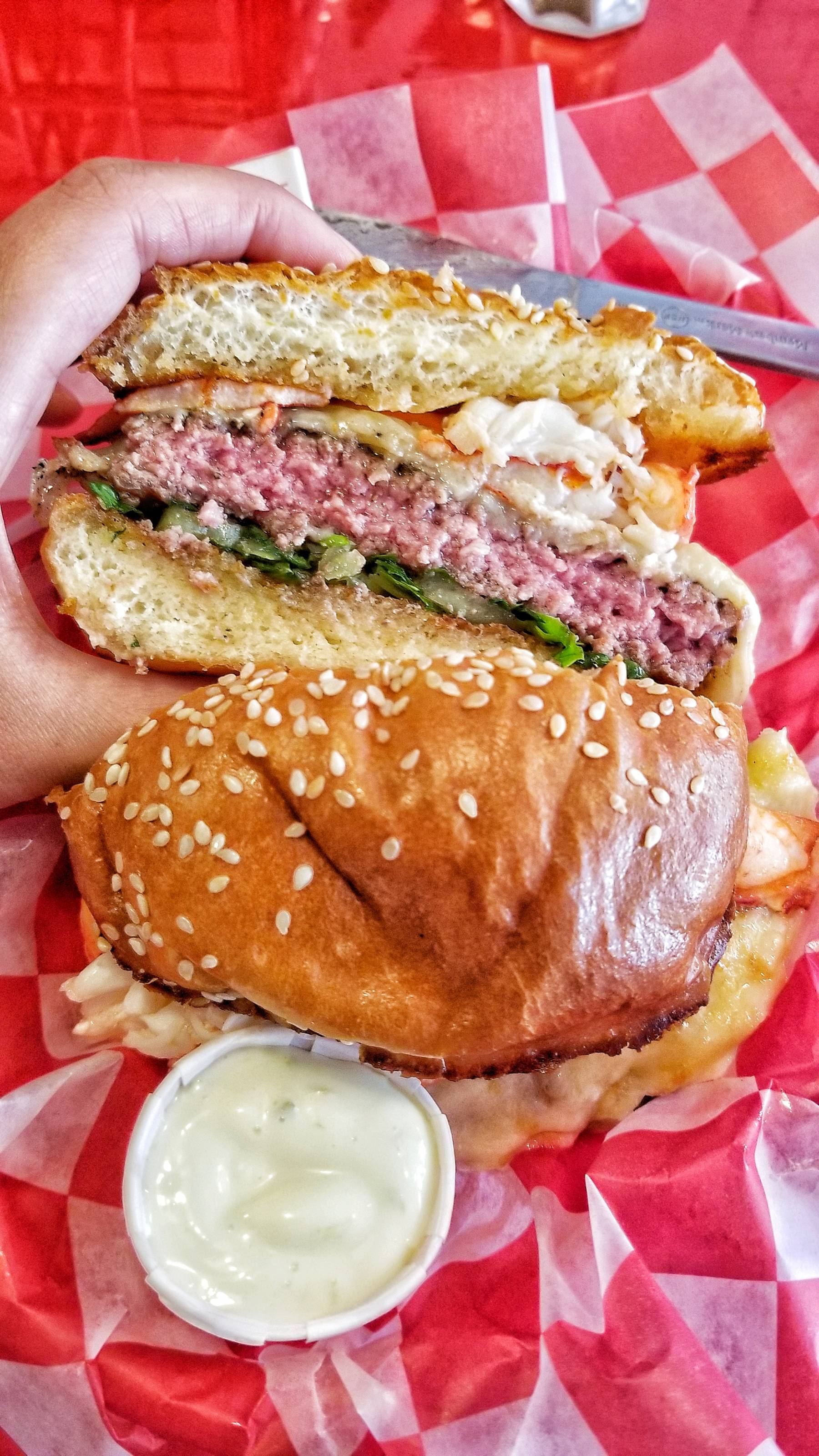 The burger looked great. I took my first bite…wow! The flavorful beef patty, loads of melted cheese, and sweet tender lobster was absolutely amazing. The sauces were yummy as well.
