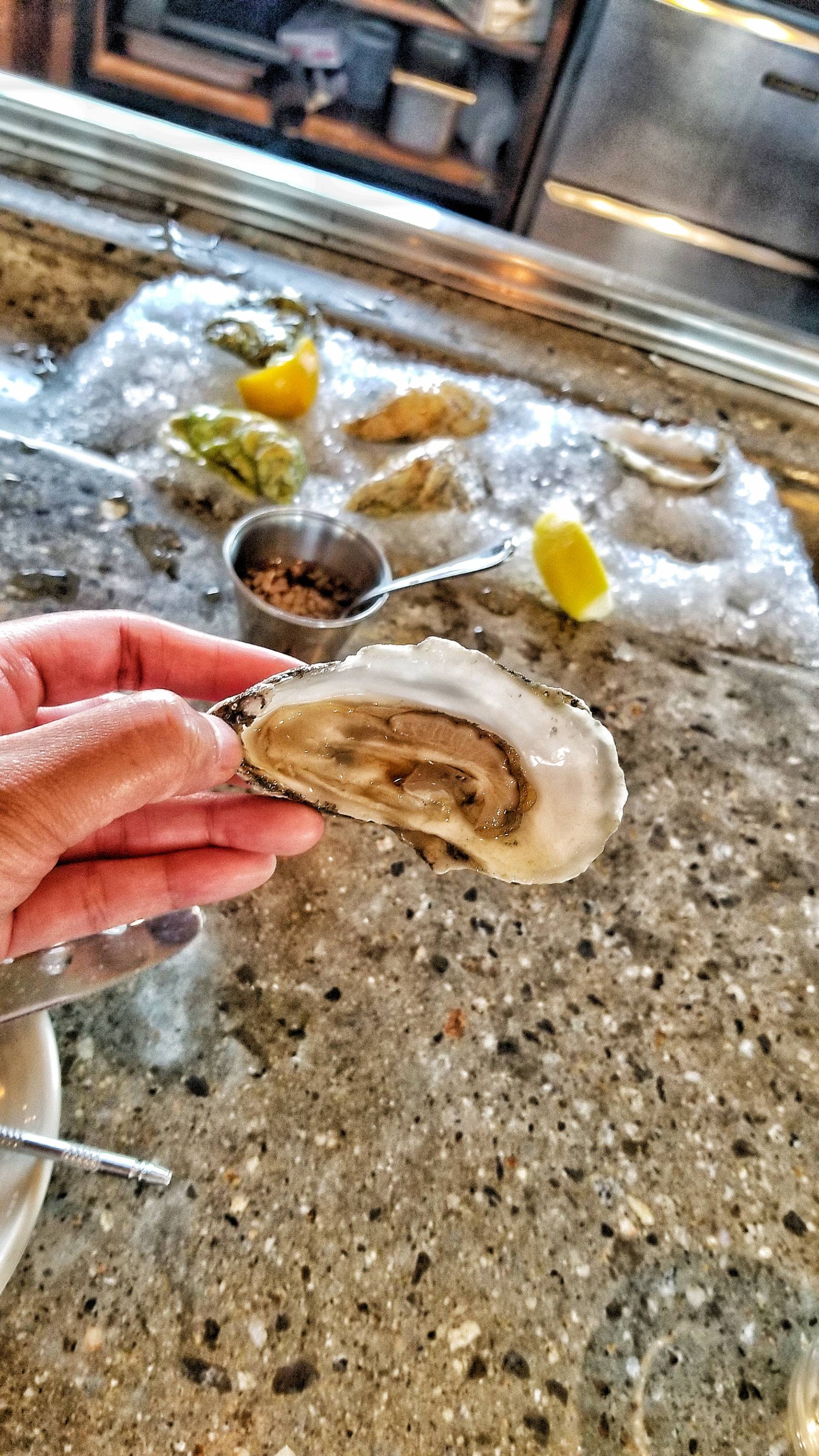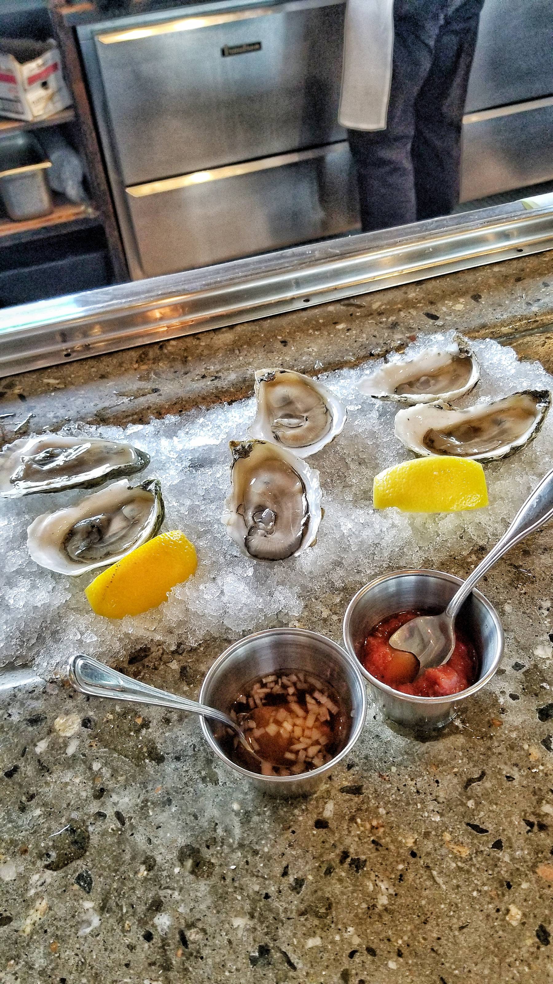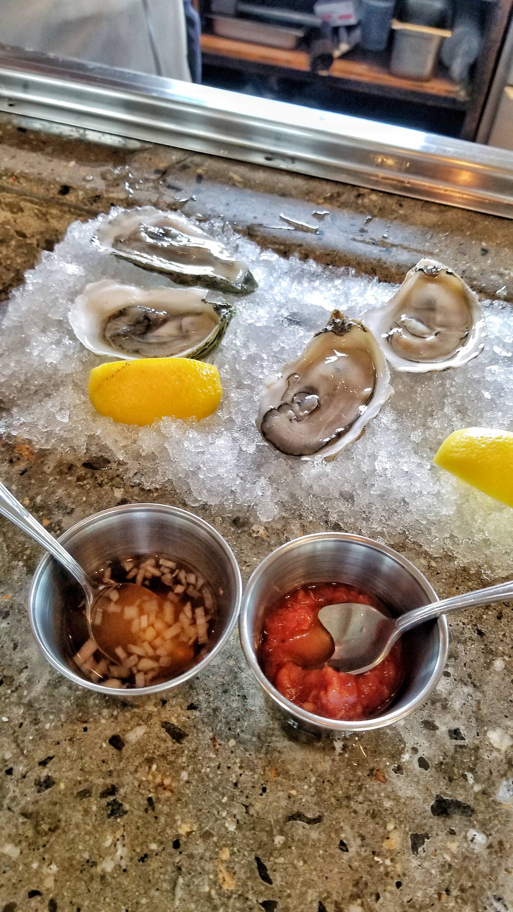 The oysters were fresh and delicious, served with lemon, house cocktail sauce, and seaweed mignonette.