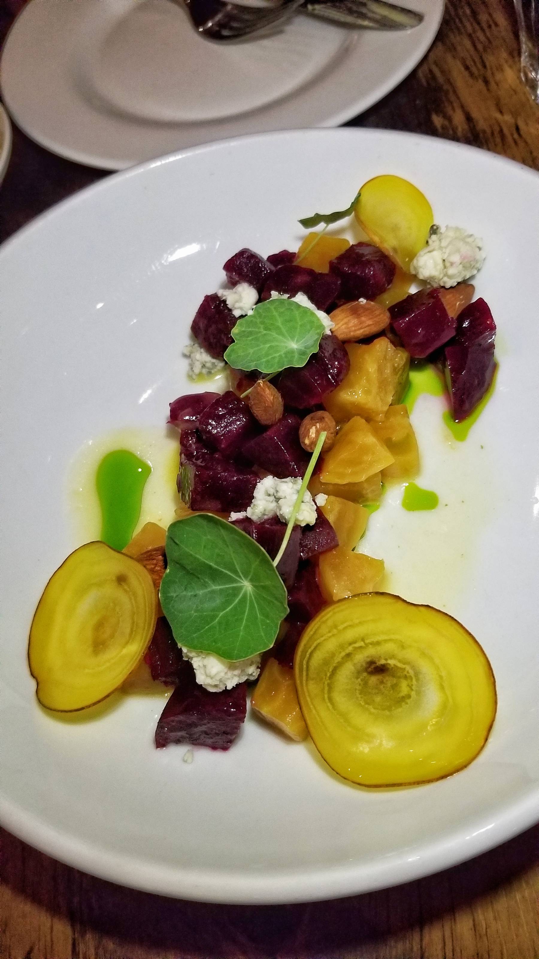 We also tried a couple salads. The seasonal Green Salad had locally grown mixed greens, goat cheese, and a simple chive vinaigrette. It was wonderful. The colorful Beet Salad had fire roasted beets, blue cheese, almonds, olive oil, and a delicious citrus vinaigrette.