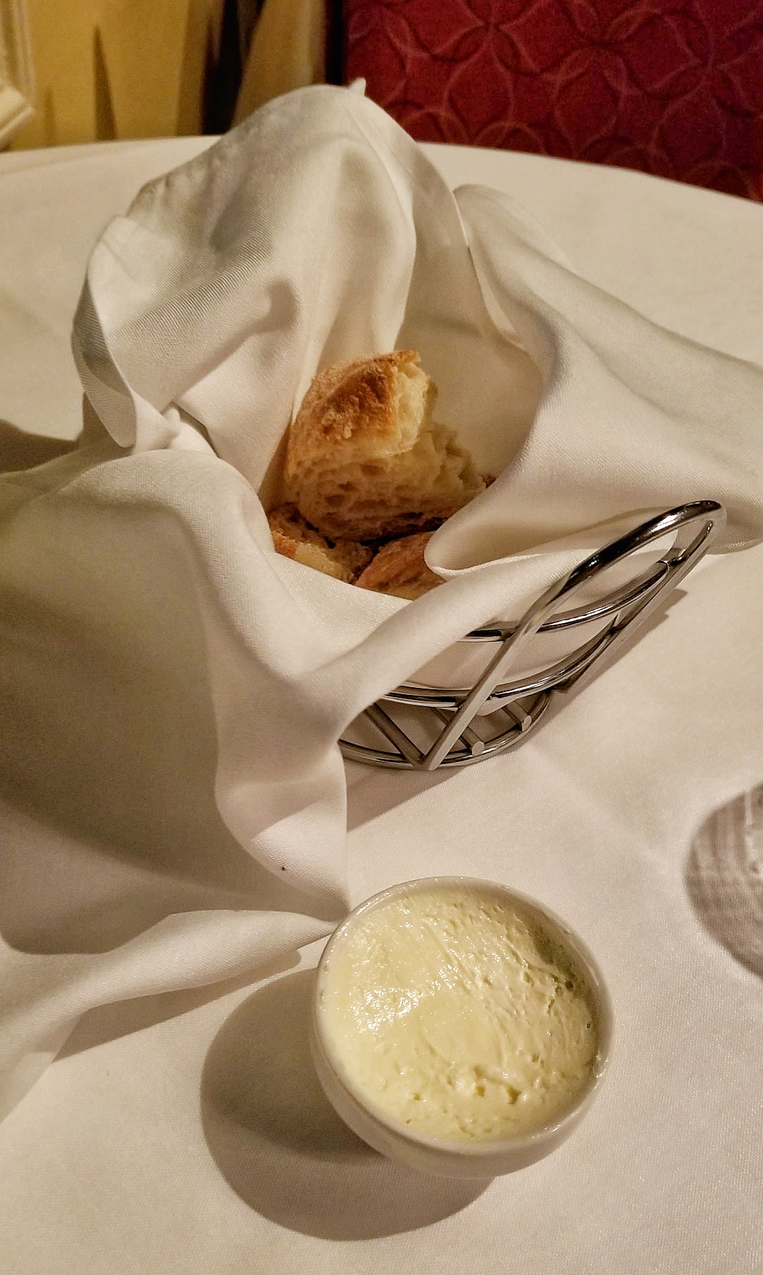 My meal started off with a glass of red wine and some bread and butter.