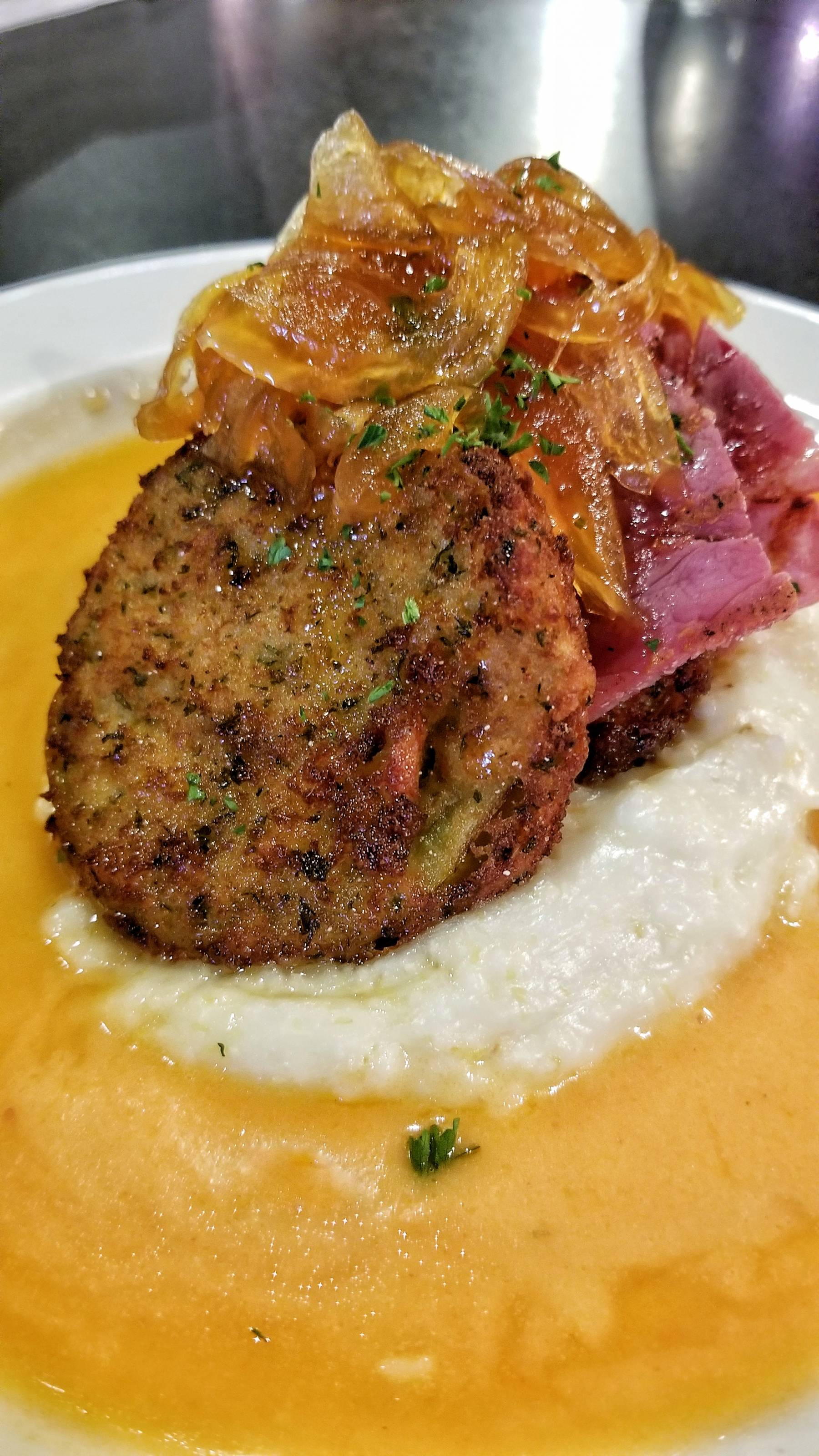 Okay, so I had to try one more app – the Pan Seared Sea Scallops with brandy bacon cream and crispy Brussels sprouts over sweet potato hoe cakes were wonderful.