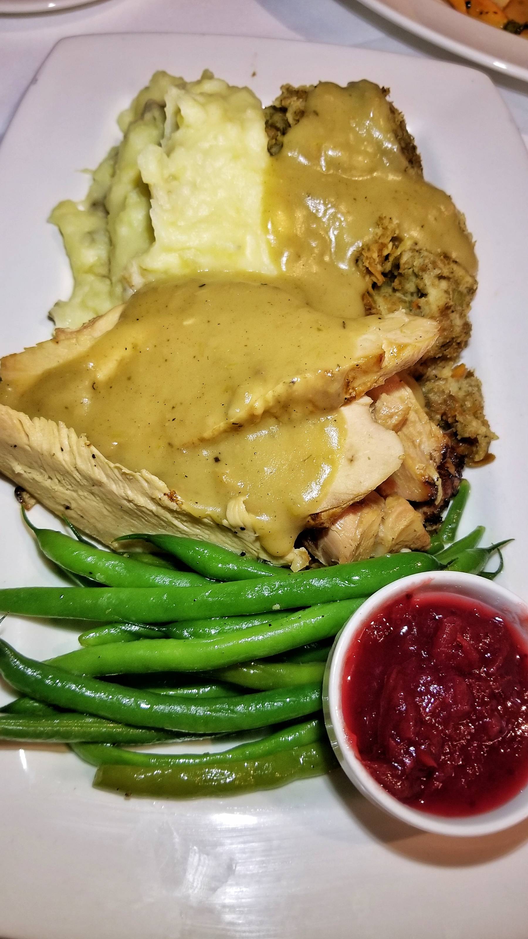 For my entree, I knew I had to get the Joyce Farms Heritage Turkey Dinner. It was a plate full of Thanksgiving classics and favorites – herb brioche stuffing, buttermilk mashed potatoes, green beans, turkey gravy, and orange scented cranberry relish. Yum!