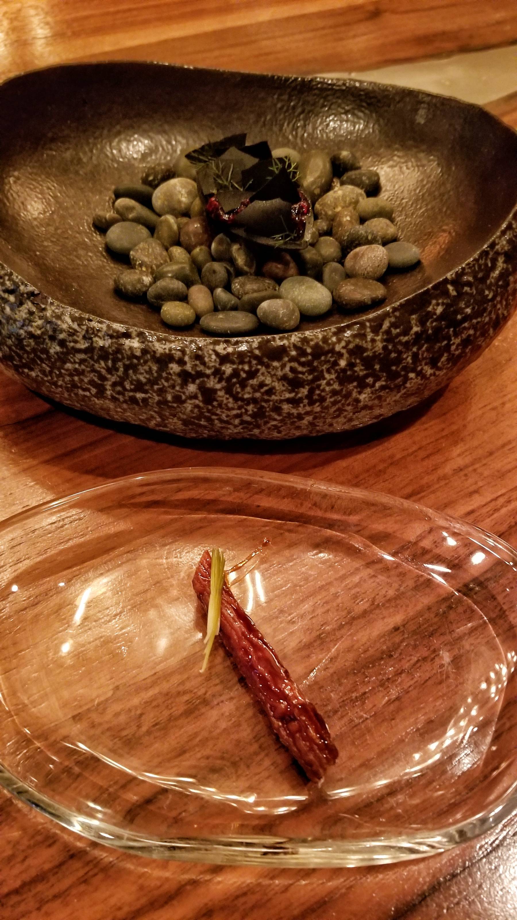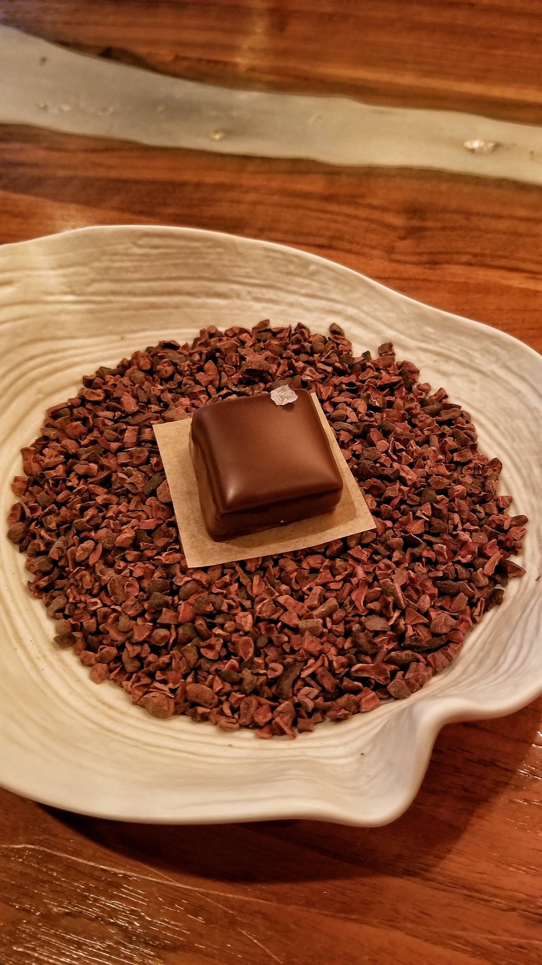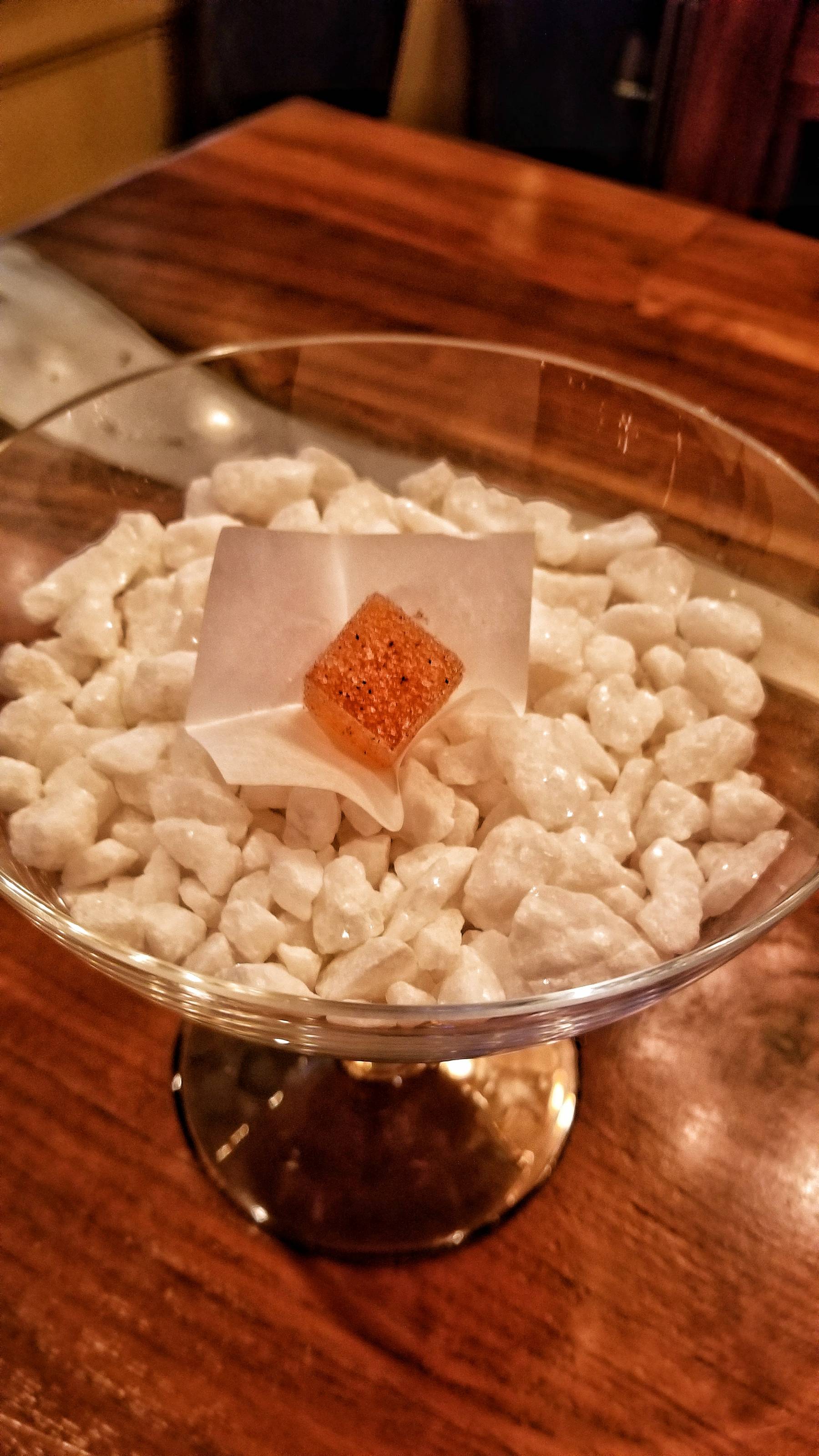 To conclude the meal, the final bites included a chocolate bonbon with sweet potato and benne seeds and an amaro cube dusted with sugar and Sichuan peppercorn.