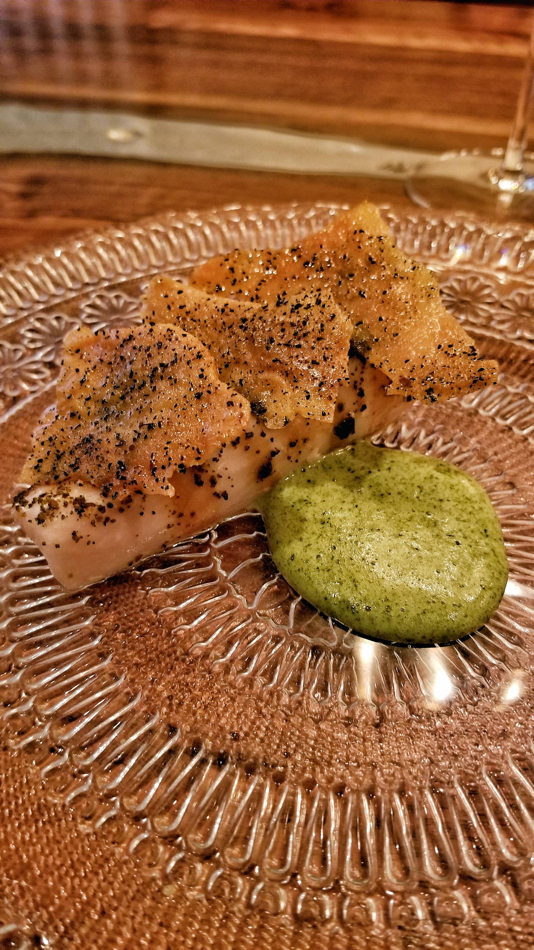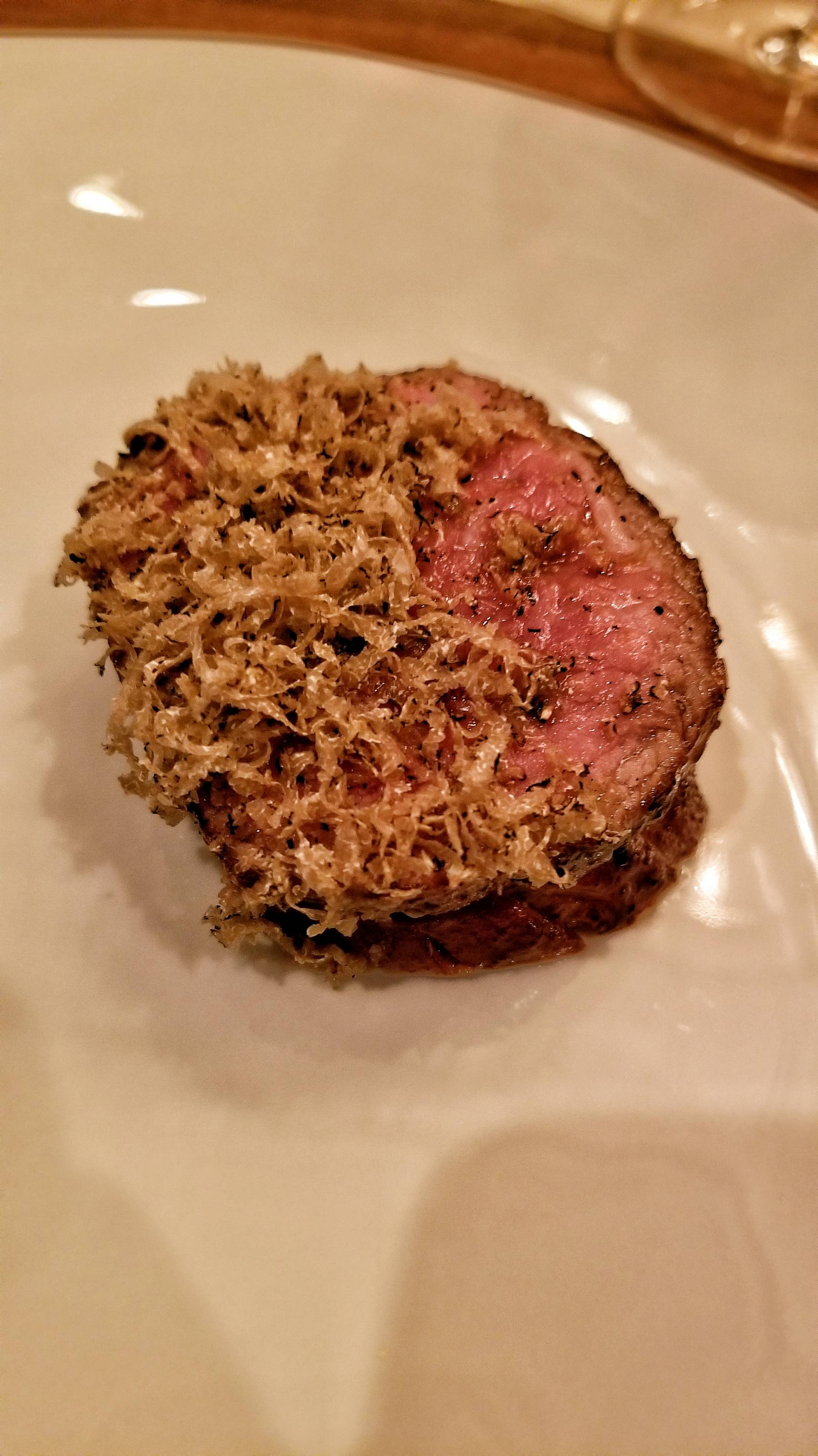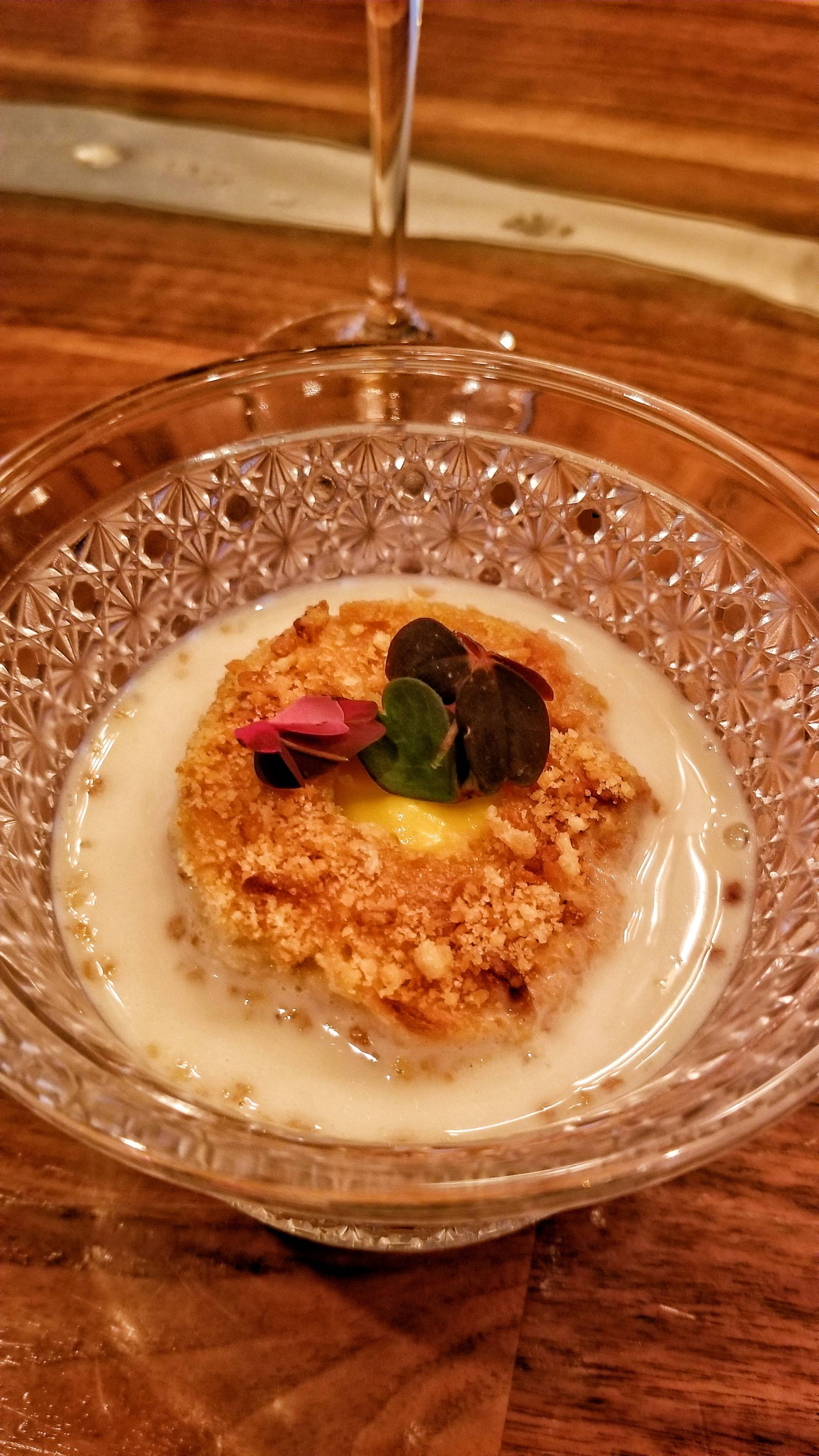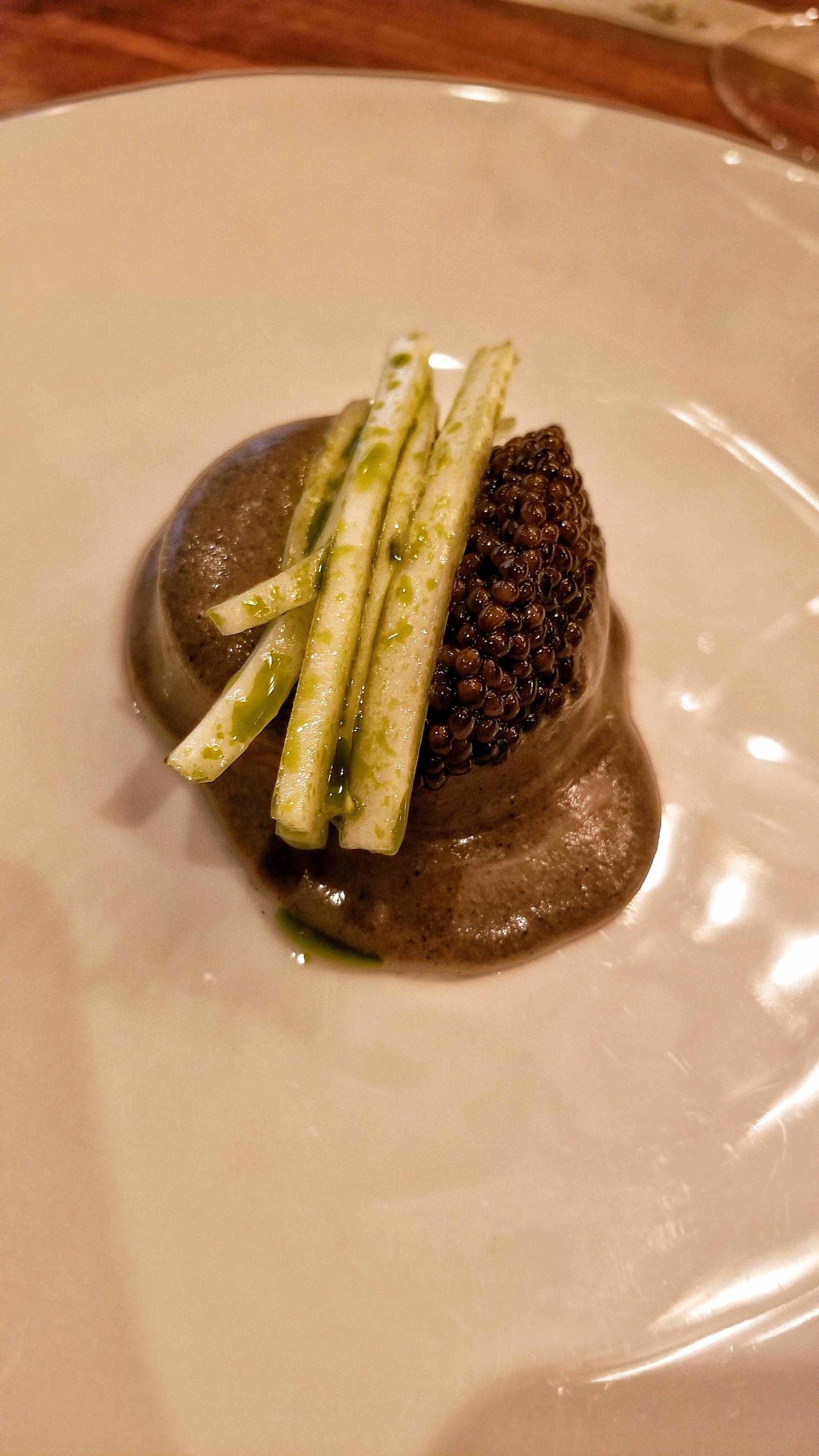 The next wine was a white from Austria. I decided to add the $35 caviar supplement which topped the tofu with cabbage and kaffir lime. An extra brut champagne was paired with a scallop with pumpkin and sunflower. An Assyrtiko from Santorini was great with the cobia poached in chicken fat with a seaweed milk purée topped with crispy chicken skins seasoned with apple skin furikake.