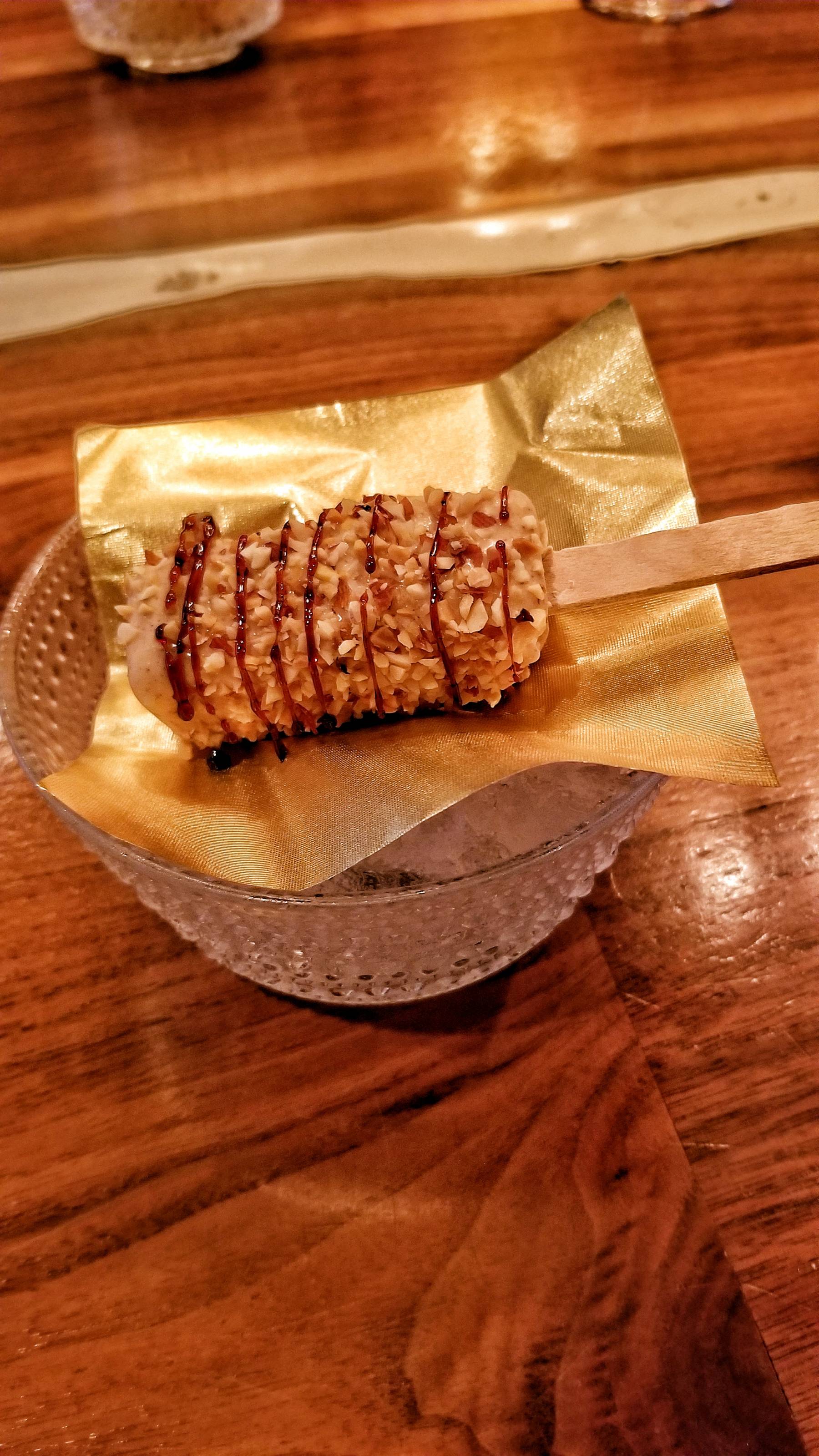 I was getting pretty full, but the dessert courses were coming up. A yummy yogurt popsicle coated with Carolina African Runner peanuts was served.