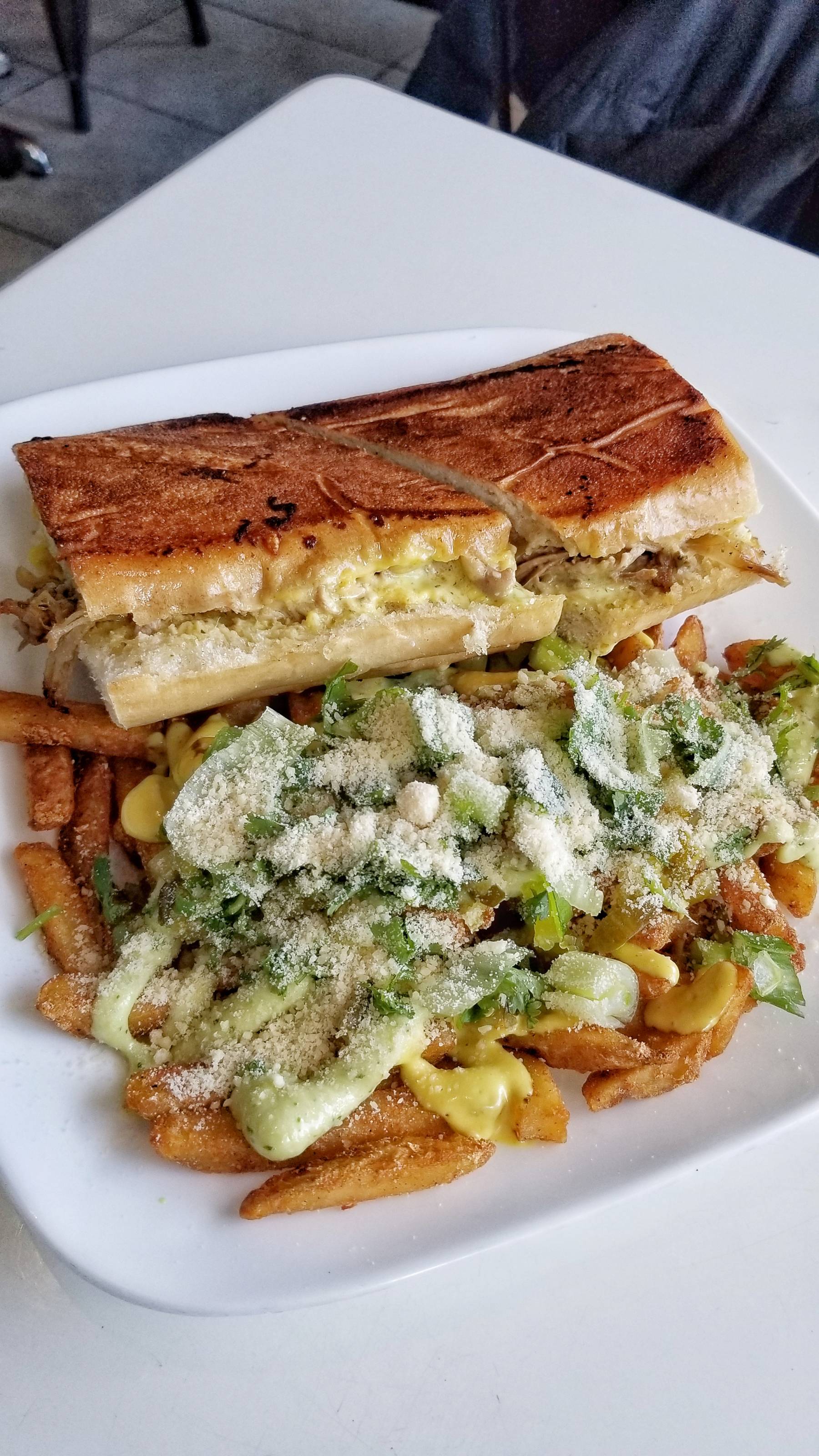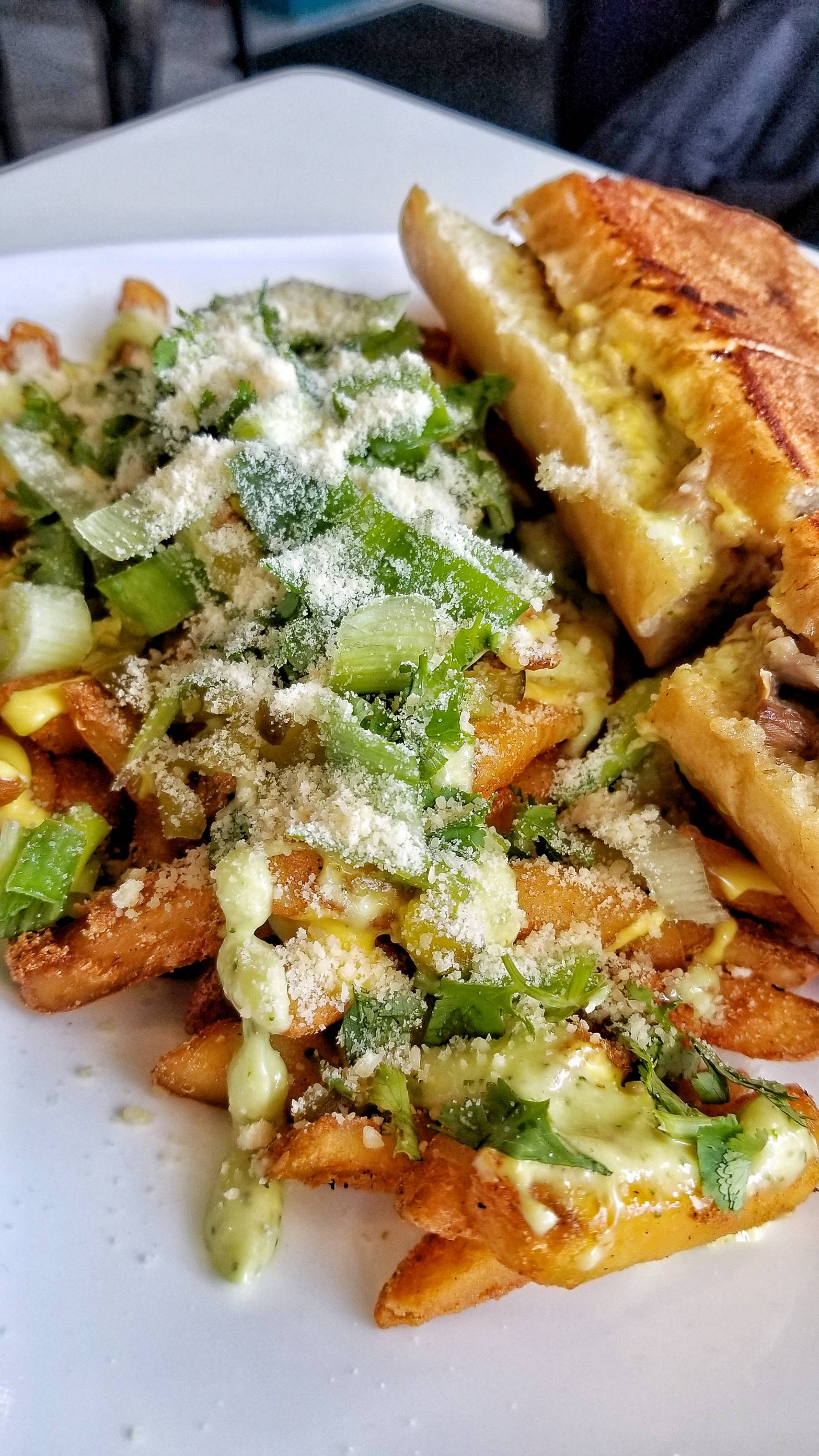 I ordered and paid at the counter then took a seat at a corner table. I had the Cuban Sandwich, their version of the classic is made with pulled pork, salami, ham, cheese, pickles, green sauce, and mustard then pressed until crispy. I enjoyed it with Green Fries which are seasoned fries topped with house cilantro and mustard sauce, dill and sweet pickles, and scallions.