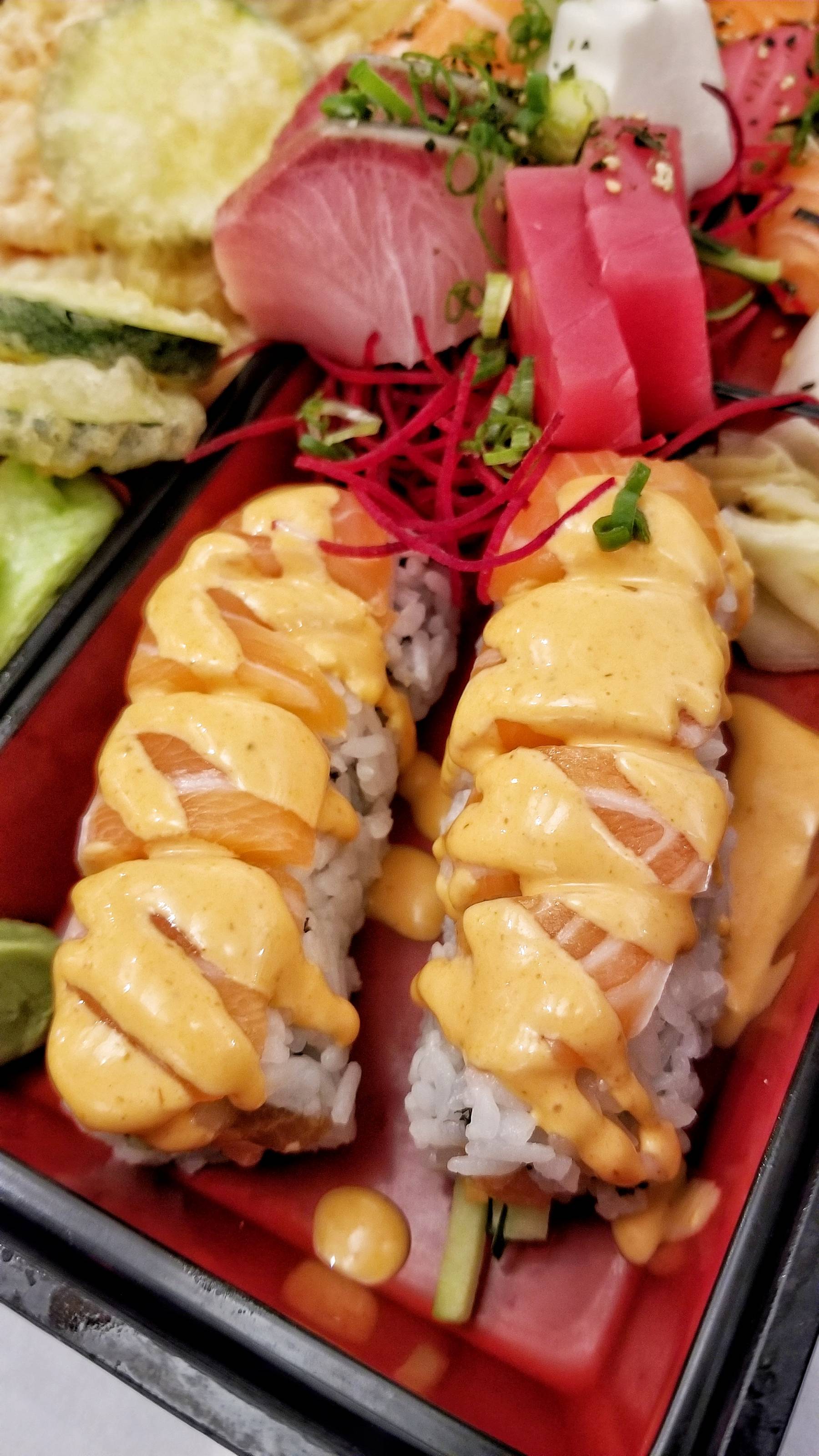The special rolls are incredible! The Devil’s Ride had spicy tuna with seared salmon, scallion, crunch, teriyaki sauce, and spicy mayo on top. I also enjoyed the Pink Salmon made with salmon, cucumber, avocado, and spicy mayo.